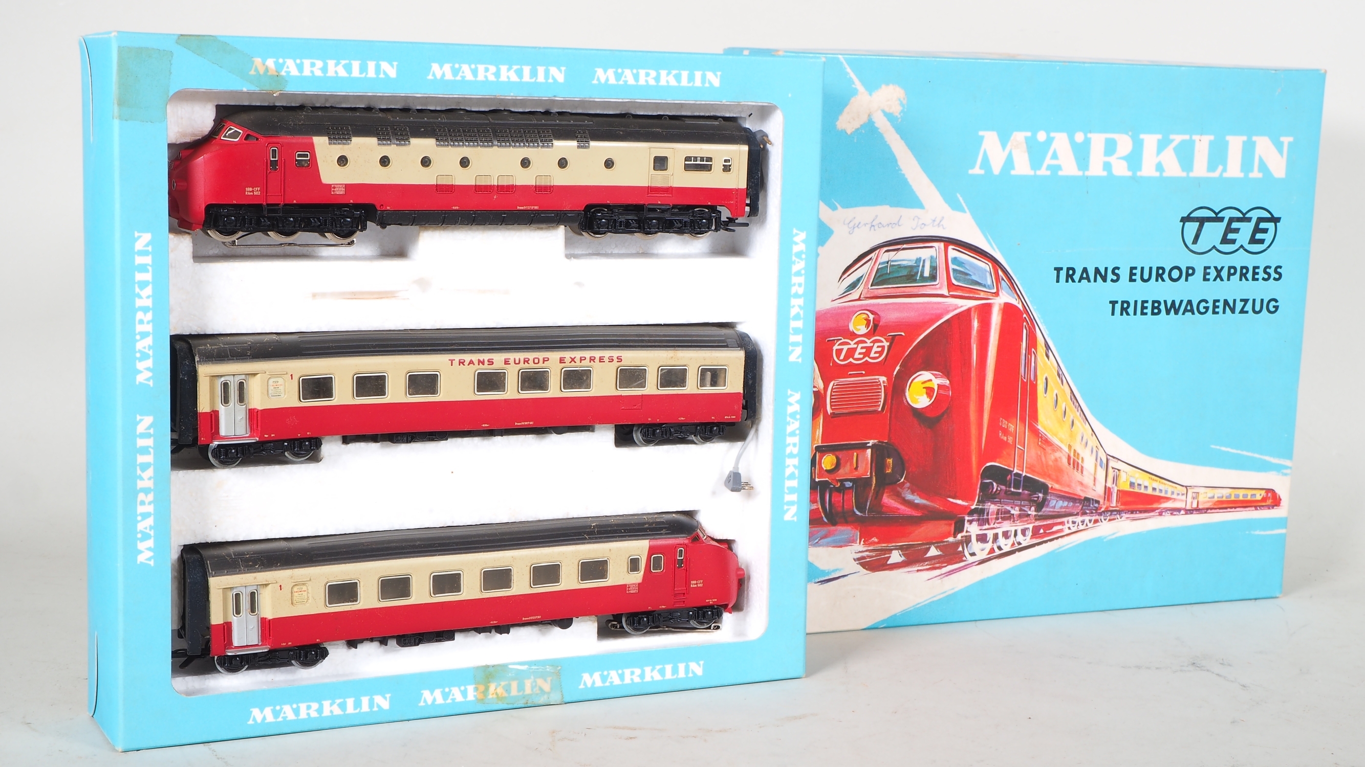 Der dreiteilige, beige/rote TRANS EUROP EXPRESS Triebwagen der SBB aus Kunststoff hat ein Motorteil mit 2 dreiachsigen Drehgestellen, die anderen Zugteile laufen mit 4 zweiachsigen Drehgestellen. Das Modell verfügt über Spitzen-Signal-Wechsel und Innenbeleuchtung. Nicht auf Vollständigkeit und Funktionstüchtigkeit geprüft. Schöner Zustand in Originalverpackung (Bilderkarton).