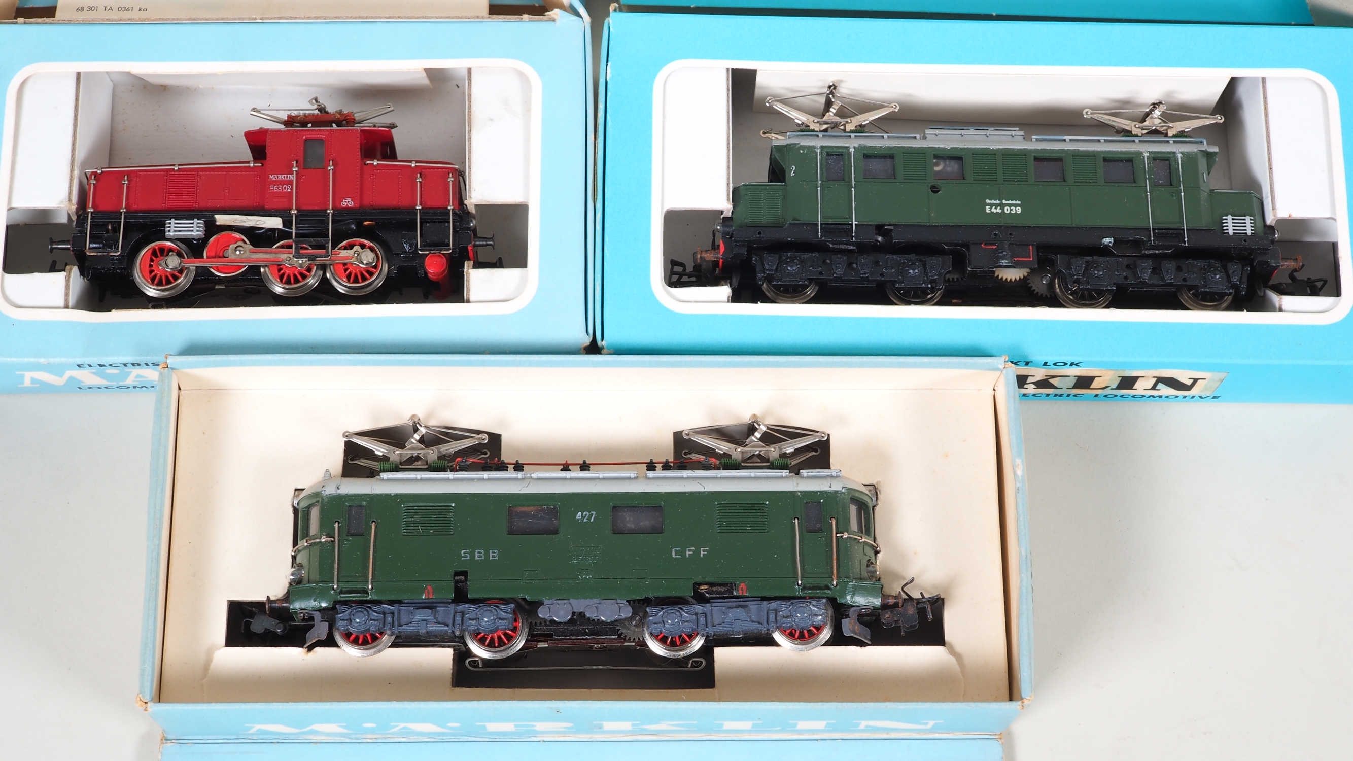 Beinhaltet eine elektrische Rangierlokomotive 3002, Baureihe E 63 der DB, Betriebsnummer E63 02, aufgesetzte Haltestangen und Leitern, in OVP mit Anleitung. Des weiteren enthalten ist eine grüne E-Lok mit Achsfolge Bo‘ Bo‘, Baureihe E44 der DB aus Guss. Leichte Rostspuren, in Originalverpackung. Außerdem enthalten ist eine dunkelgrüne RET 800 Elektrische Lokomotive Re 4/4 der SBB mit der Artikelnummer 3014 mit leichten Rostspuren (siehe Bilder) in Originalverpackung. Nicht auf Vollständigkeit und Funktionstüchtigkeit geprüft.