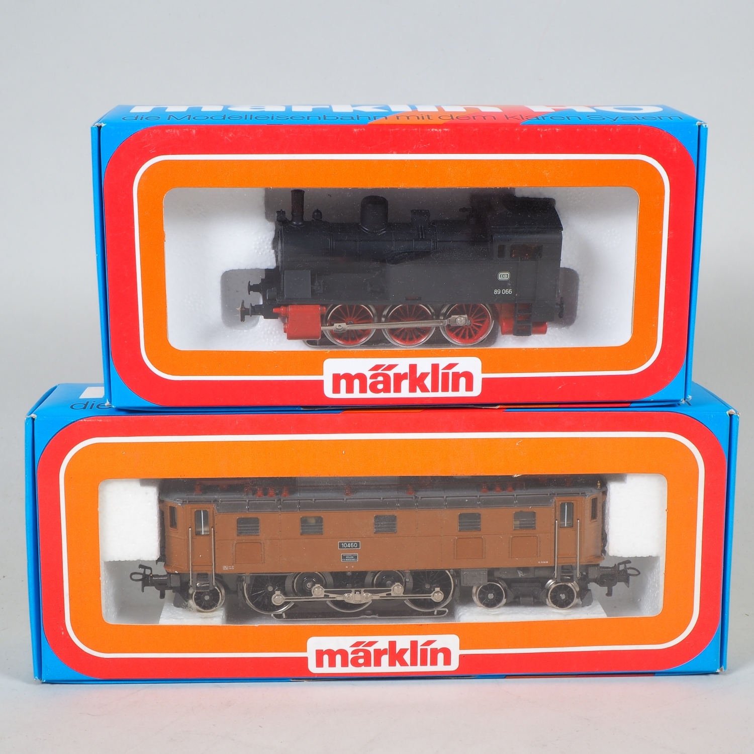 Schwarze Tenderlokomotive 3104 mit Achsfolge C, Baureihe BR 89 der DB, teilweise rot lackiert; seitlich aufgedruckte DB-Beschriftung mit Betriebsnummer 89 066. Befindet sich in Originalverpackung mit Anleitung und erscheint in schönem, unbespielten Zustand. Des weiteren angeboten ist eine braune Elektrische Lokomotive 3151 der Serie Ae 3/6" der SBB mit hellgrauem Dach, braunrot lackierten Dachleitungen und Achsfolge 2’C 1′. Die Aufschrift der Betriebsnummer 10460 beigeweiß und auf schwarzem Grund gedruckt. In Originalverpackung mit Anleitung und erscheint in schönem Zustand. Nicht auf Vollständigkeit und Funktionstüchtigkeit geprüft.