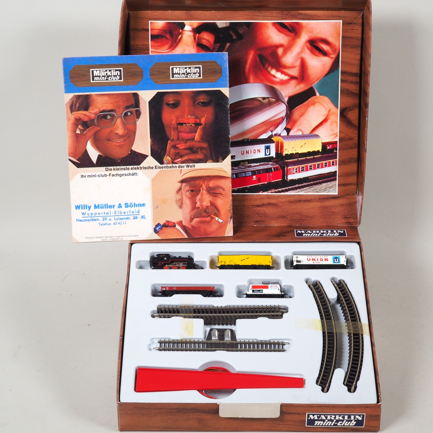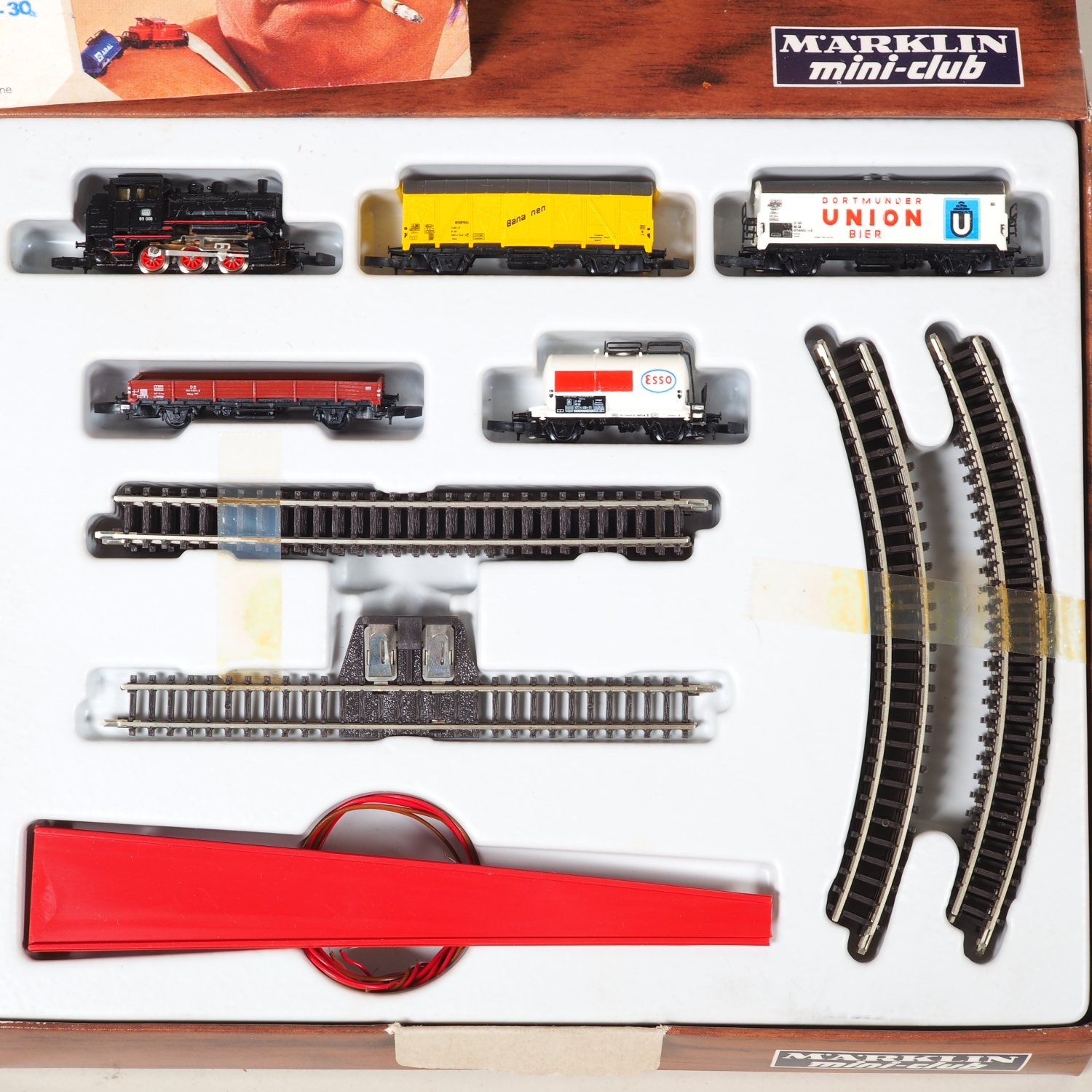 Das komplette Märklin mini-club 1:220 Set enthält die Tenderlokomotive 8800 Dampflok BN 89 006 der DB, weißen Bierwagen 8601 "Dortmunder Union Bier", gelben Bananenwagen 8606, Kesselwagen 8612 "Esso", Niederbordwagen 8610, gerade, sowie gebogene Schienenteile und ein Aufgleisungsgerät. Sehr guter Zustand, komm in Originalverpackung mit charakteristischer Teakholz-Struktur. Nicht auf Vollständigkeit und Funktionstüchtigkeit geprüft.
