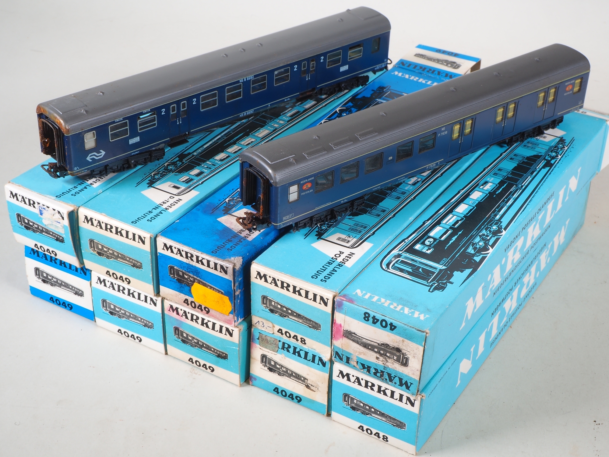 Drei Schnellzug-Postwagen der staatliche Eisenbahngesellschaft der Niederlande (P7900). Dunkelblauer Blechwagen mit silberfarbenem, abnehmbaren Dach. Weiße Aufschriften NS P 7939 NEDERLANDSE POSTERIJEN und farbiges Postwappen. Eingesetzte Fenster mit schwarzem Rand, teilweise gelb vergittert. In hellblauer Originalverpackung, teils mit Seidenpapier, teilweise Lagerschäden und in im unterschiedlichem Zustand (siehe Bilder). Wurde von 1967-1972 produziert, vermutlich frühere Modelle. Fünf Personenwagen 2.Klasse der staatliche Eisenbahngesellschaft der Niederlande. Dunkelblauer Blechwagen mit silberfarbenem, abnehmbaren Dach. Weiße Aufschrift NS B 6692. Eingesetzte Fenster mit schwarzem Rand. Frühe Modelle ohne NS-Doppelpfeil (1967 – 1970). In hellblauer Originalverpackung, teils mit Seidenpapier, Lagerschäden und in im unterschiedlichem Zustand (siehe Bilder). Zwei Personenwagen 2.Klasse der Niederländische Staatsbahn. Dunkelblauer Blechwagen mit silberfarbenem, abnehmbaren Dach. Weiße Aufschrift NS B 6692 mit NS-Doppelpfeil. Eingesetzte Fenster mit schwarzem Rand. In blauer Originalverpackung, teils mit Seidenpapier, Lagerschäden und in im unterschiedlichem Zustand (siehe Bilder). Vermutlich Version aus den 1980er Jahren. Vollständigkeit und Funktionstüchtigkeit nicht geprüft.