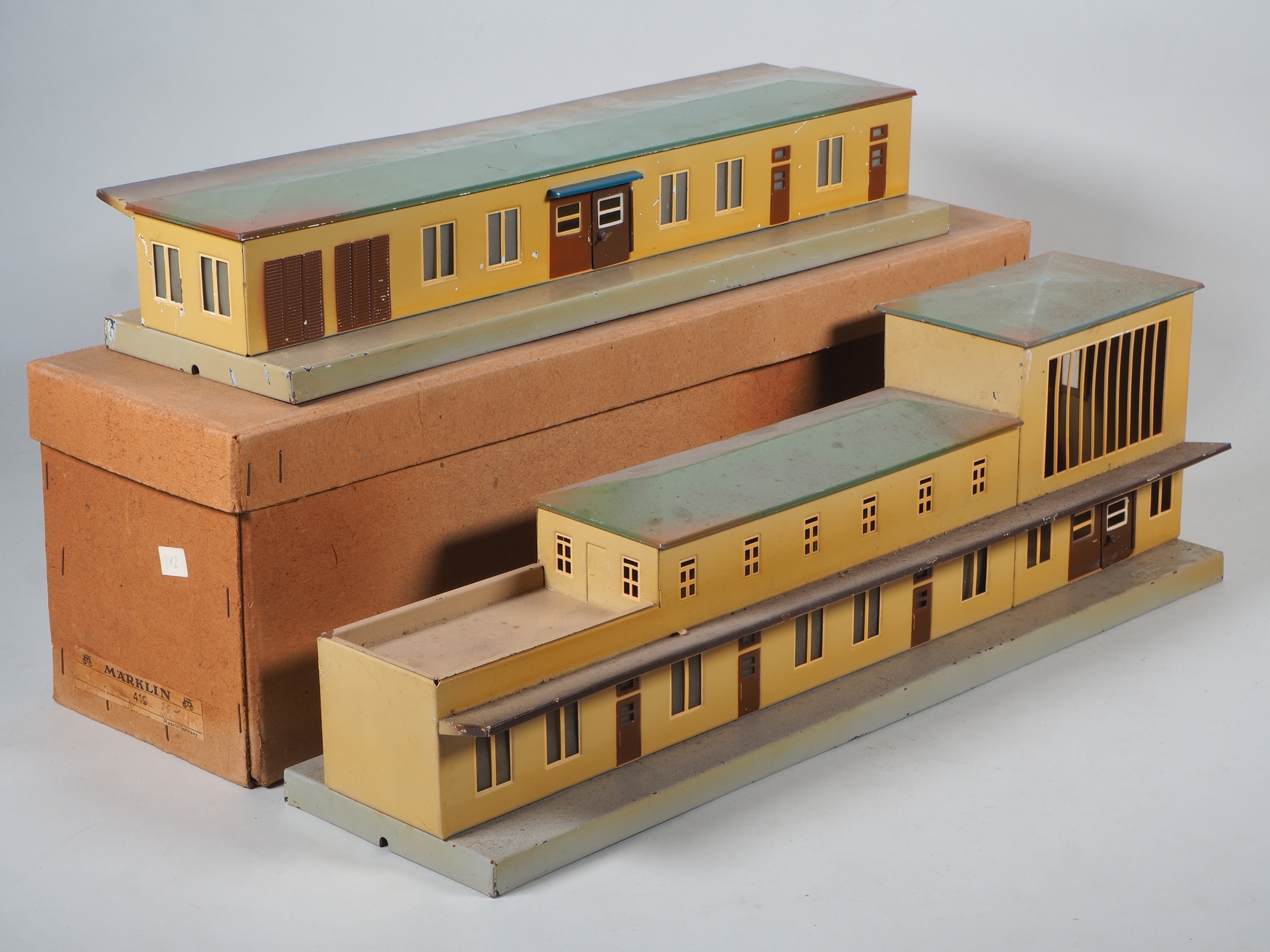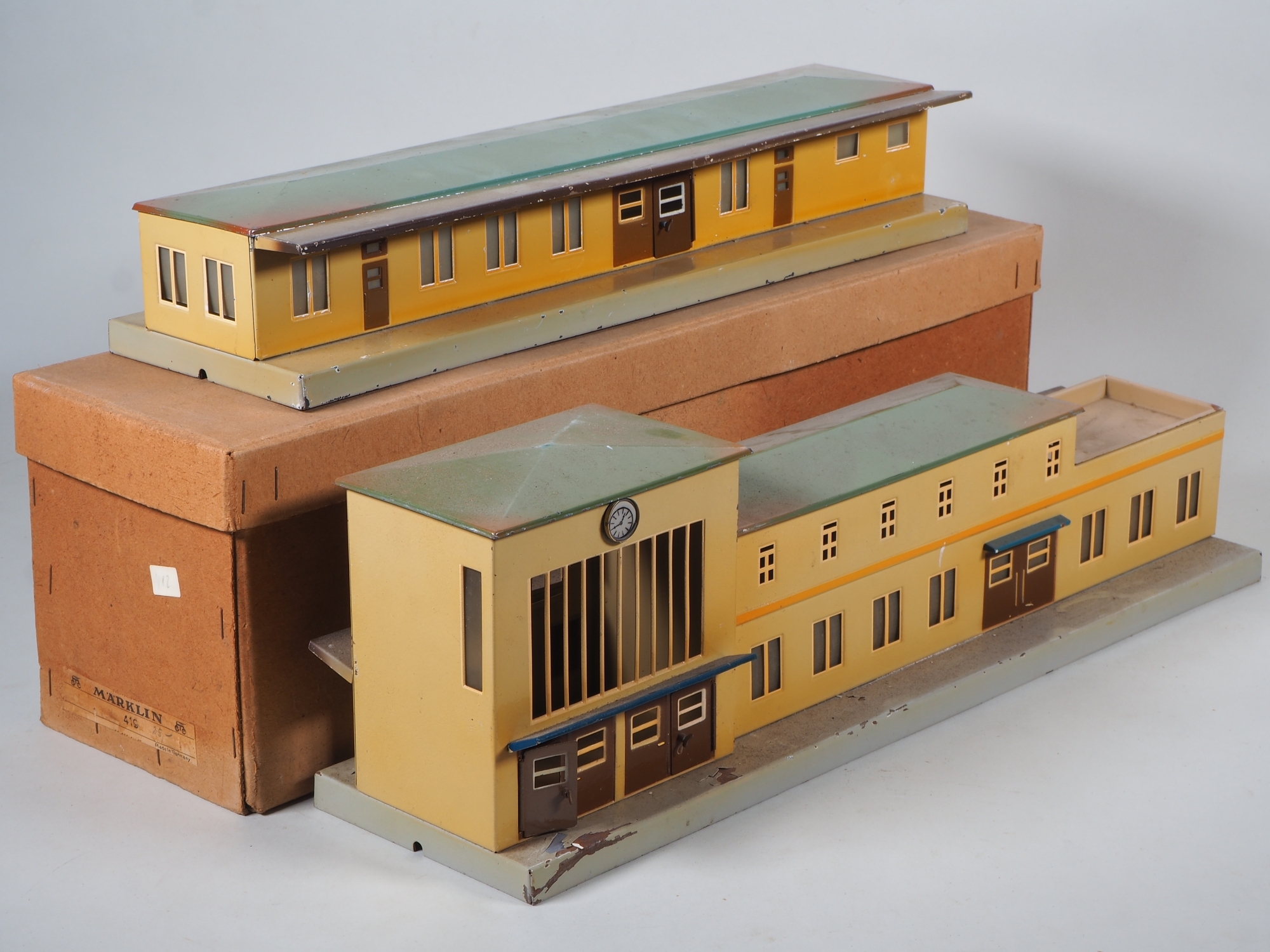 Bahnhofshauptgebäude 419 mit Dachterasse und Lichthof, Türen zum Öffnen, Fenster mit Cellonscheiben (teilweise fehlend), imitierte Uhr. Wände beige, Sockel grau, Dach abnehmbar und grün lackiert. Gebrauchsspuren, Lackabsplitterungen, aber schöner Originalzustand in Originalkarton. Einstöckiger Bahnhof 415, beige mit Türen zum Öffnen, als Verlängerung für 419 verwendbar. Grünes, abnehmbares Dach, Fenster mit Cellonscheiben. Gebrauchsspuren, Lackabsplitterungen, aber schöner Originalzustand.