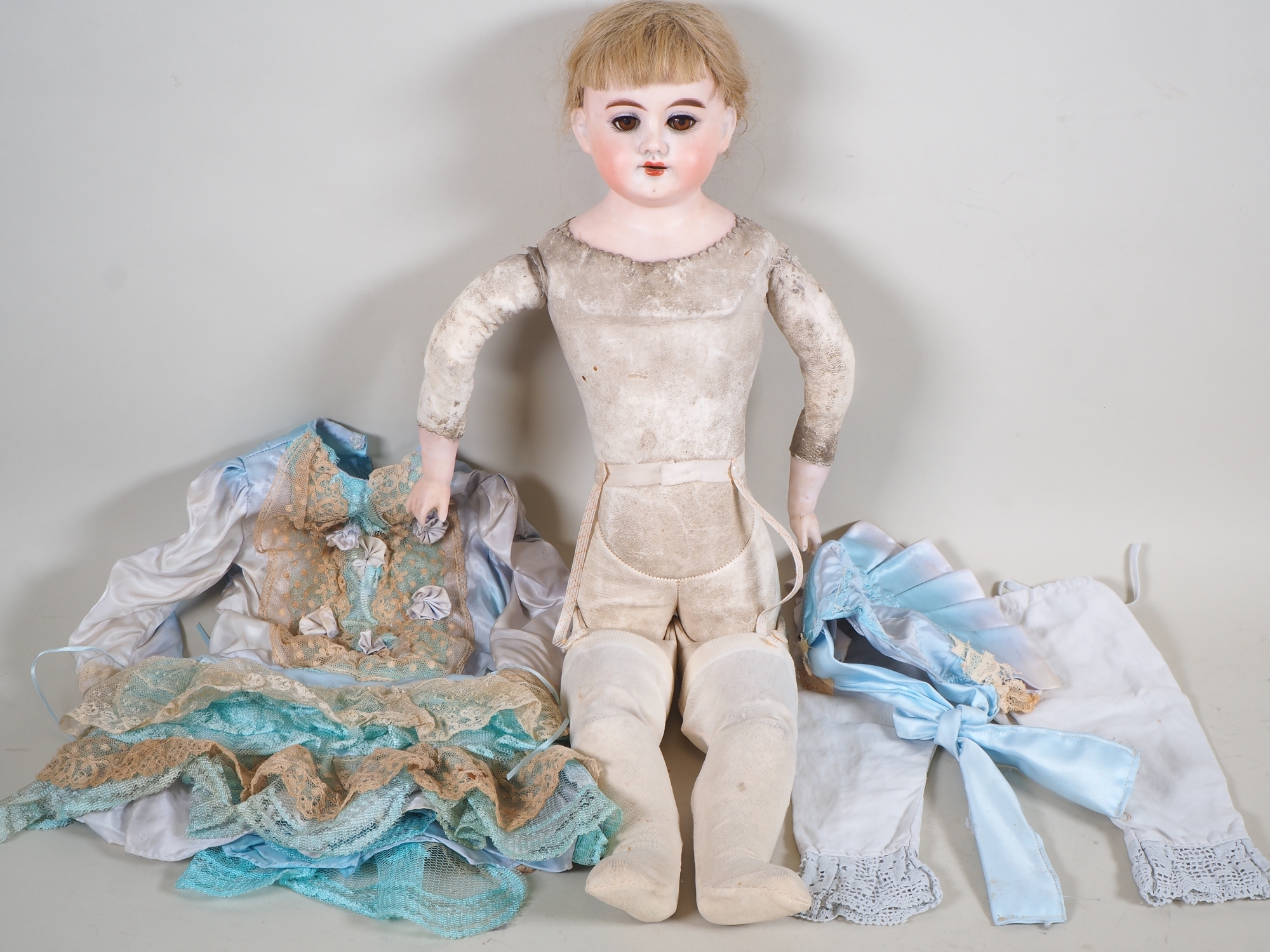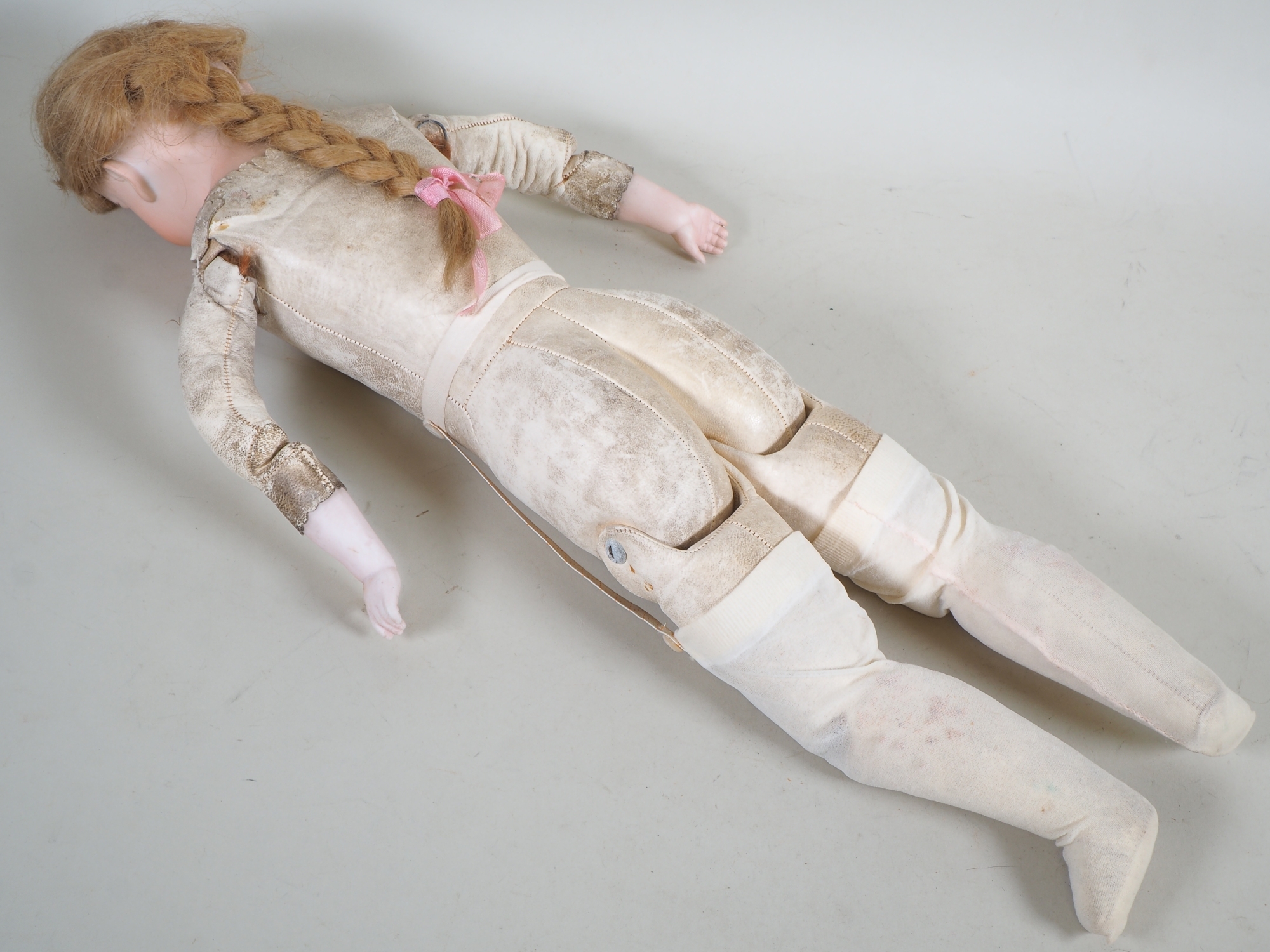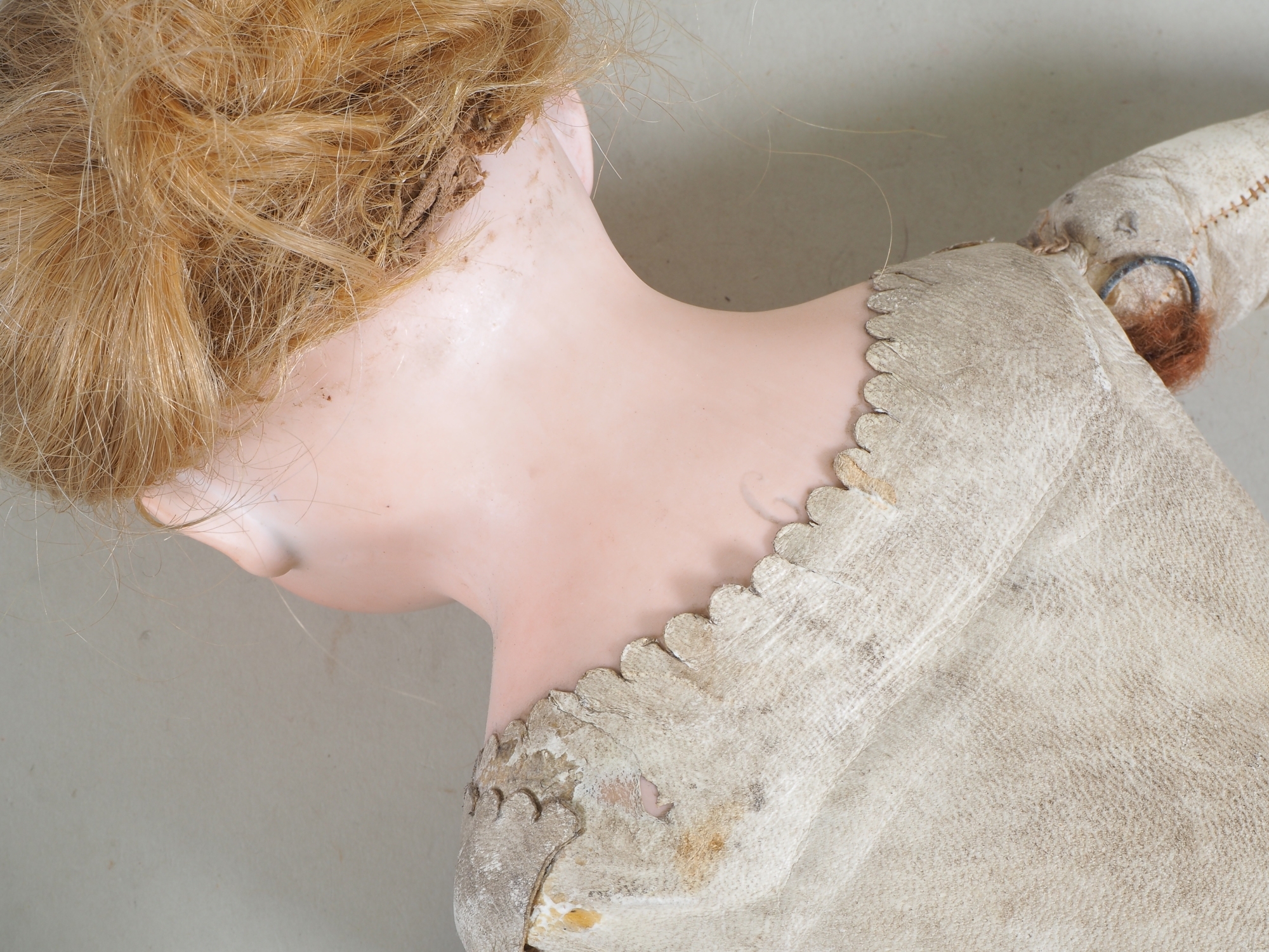 Körper aus Ziegenleder, ausgestopft, Porzellan Brustkopf an der Unterseite bezeichnet mit 6, sonst keine Signatur ersichtlich, Hände mit Unterarm aus Porzellan, Porzellan Teile intakt, mit Schlafaugen sowie offener Mund mit zwei Zähnchen. Kopf mit Charakterzügen, dazu alte Kleidung als Beigabe. Bespielt. H. ca. 57cm