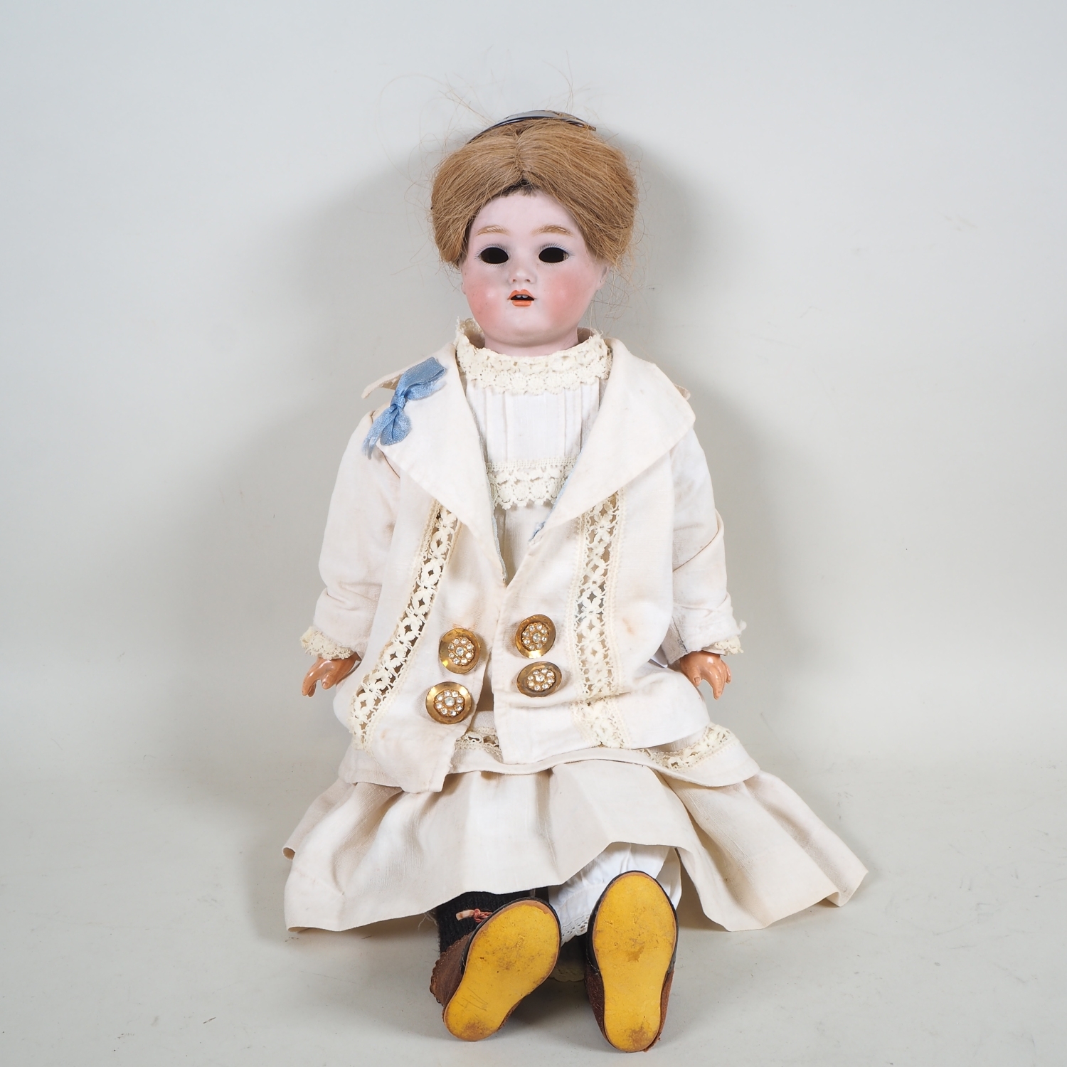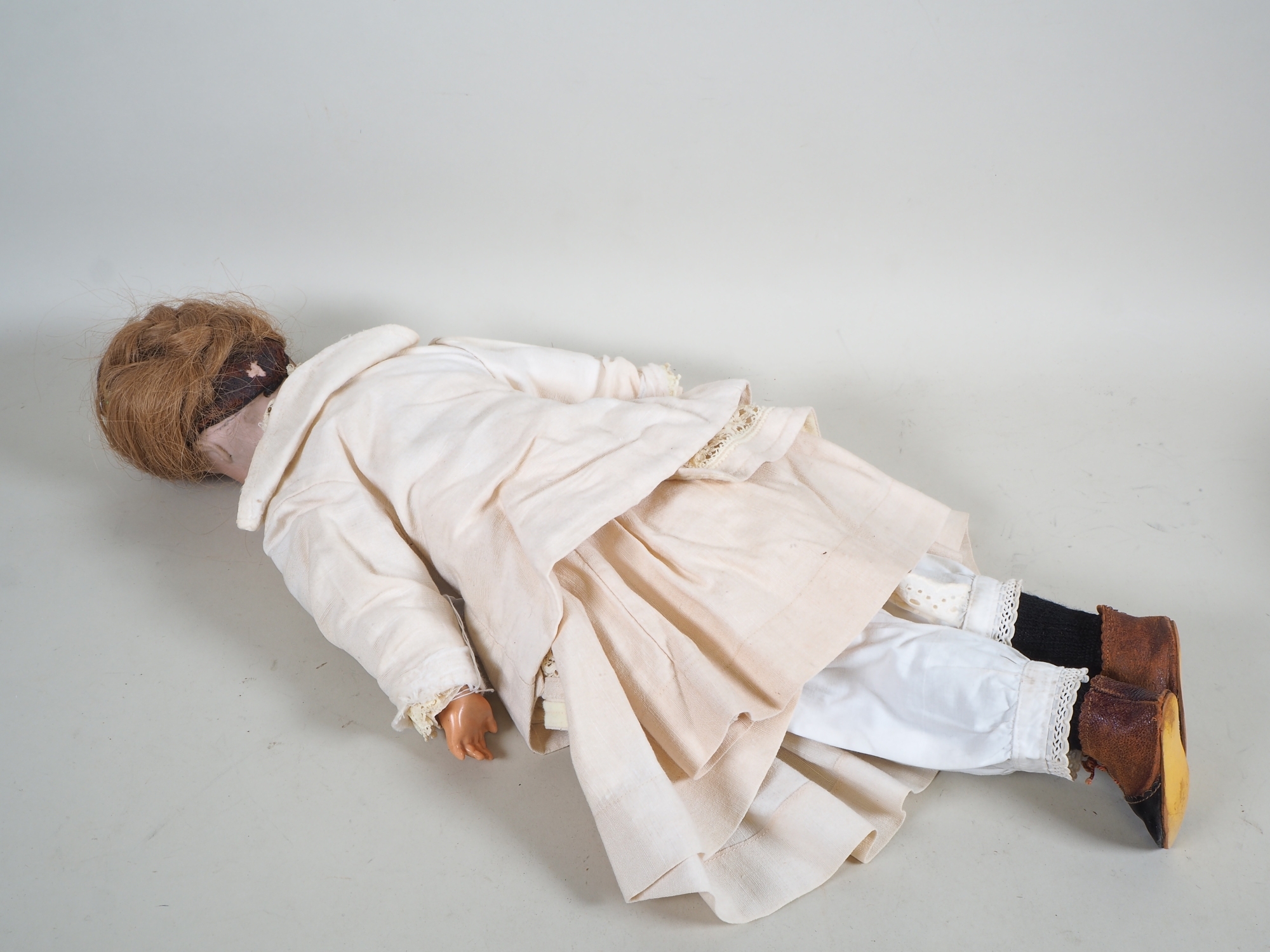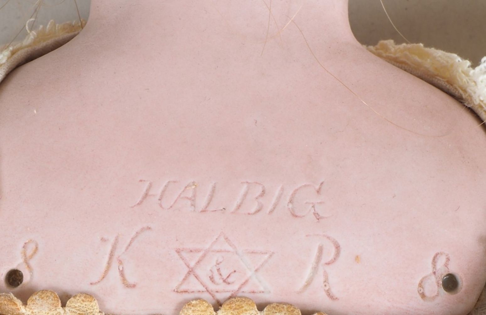 Brustkopf aus Porzellan, sehr schöne Gesichtszüge, offener Mund mit zwei sichtbaren Zähnen, Augen lose im Kopf liegend, Körper aus feinem Leder und ausgestopft. Originale alte Kleider rückseitig unten signiert "Halbig" darunter K&R. Kopf intakt, sonst bespielter Zustand. Deutschland wohl vor 1900. H. 55cm