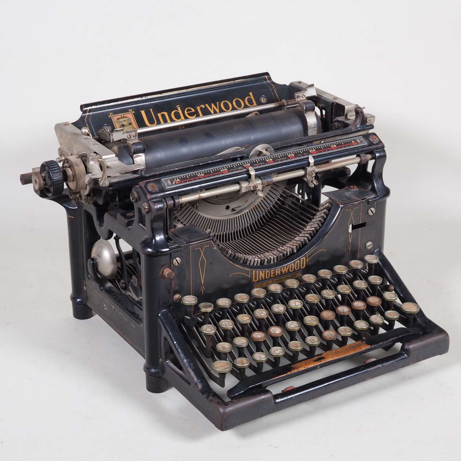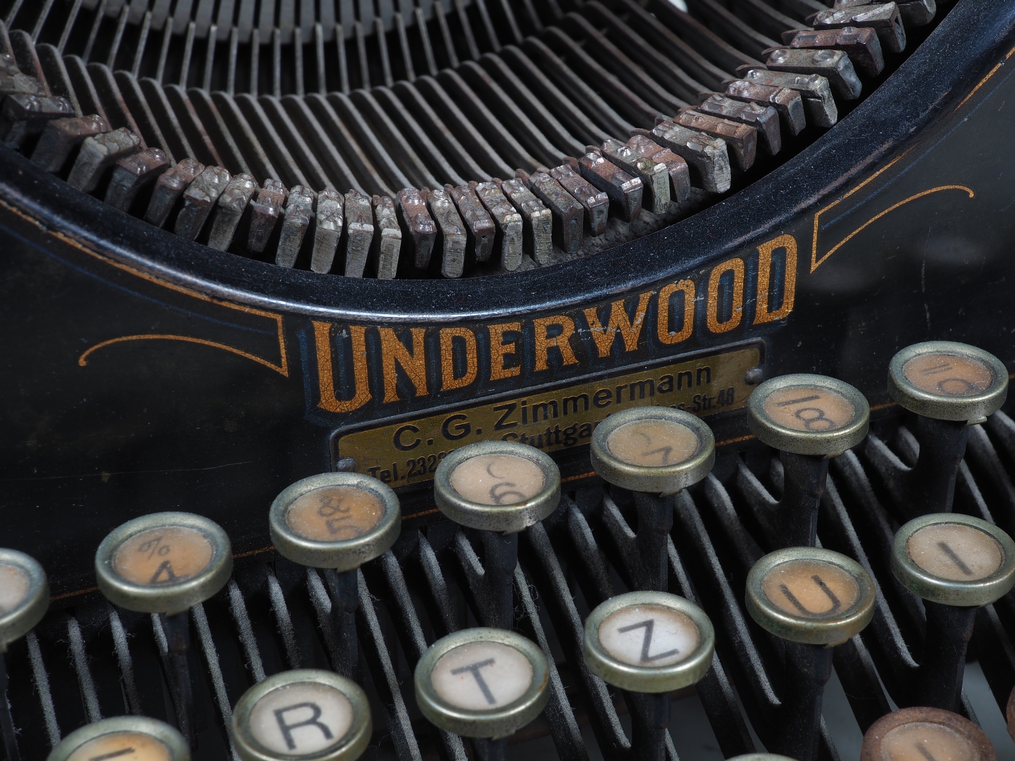 Typenhebelmaschine mit Vorderanschlag und einfacher Umschaltung, ausgestattet mit deutschem Typensatz, schwarzes Eisengehäuse. Hersteller: Underwood Typewriter Co., USA, Vertrieb: General-Vertreter Muggli, Frankfurt a. M., Verkauf: Schreibmaschinenhandlung C. G. Zimmermann, Stuttgart (siehe Bilder). Die "Underwood" gilt als "Mutter der modernen Schreibmaschine" und war weltweit Vorbild für viele nachfolgende Schreibmaschinen. Alters- und Gebrauchsspuren. Funktion nicht geprüft. Höhe: ca 23 cm, Tiefe: ca. 30 cm, Breite: ca. 39 cm. Gesamtgewicht: 12,4 kg.