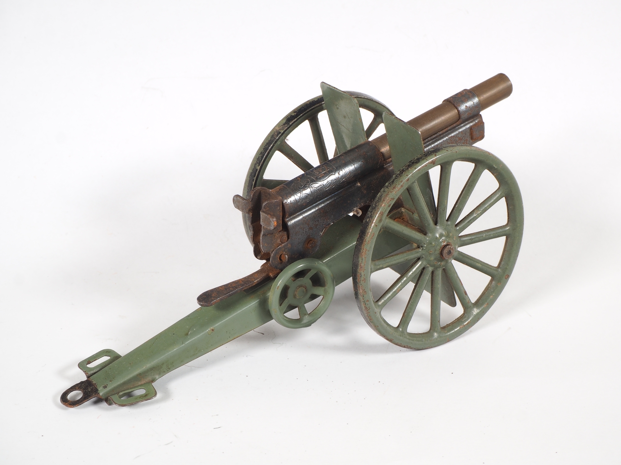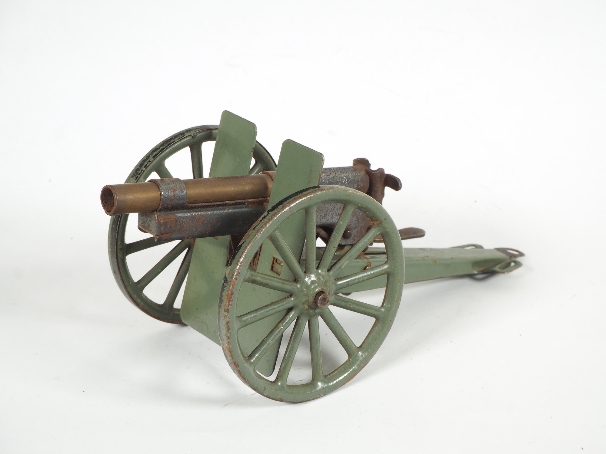 Blechausführrung, Räder drehbar gelagert, Kanone mit altem Märklin Emblem, Spann- und Auslösmechanismus funktionsfähig, flugrostig. L. 18cm.