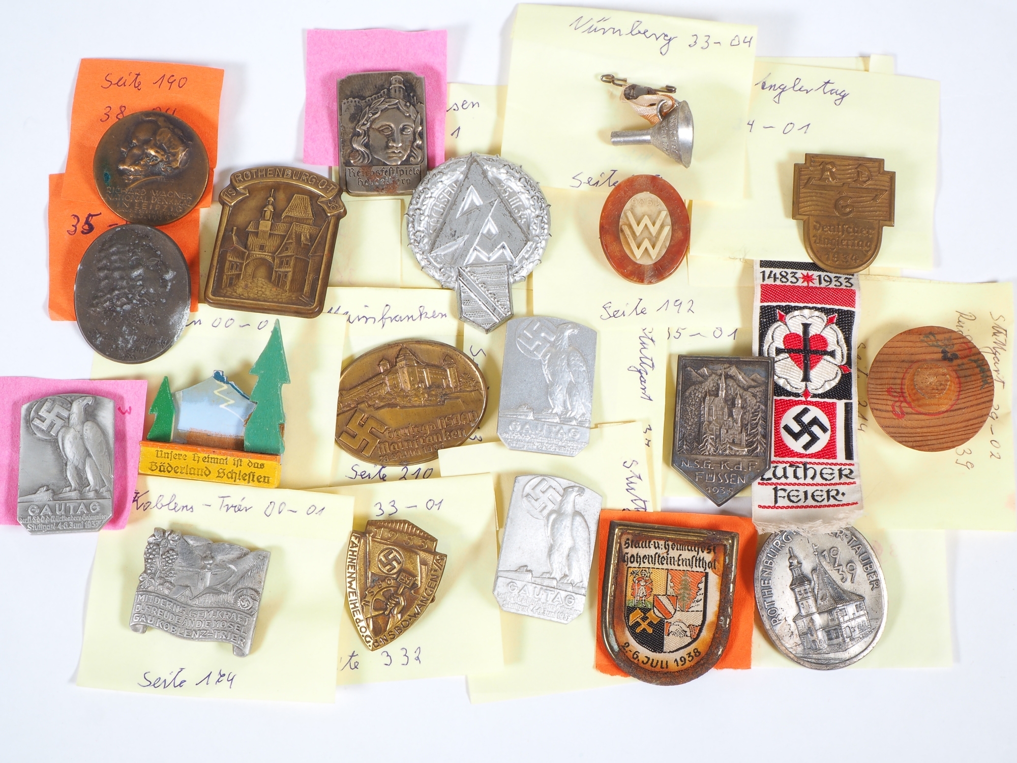 Aus dem Nachlass eines Winterhilfswerk (WHW) Abzeichen bzw. Spendenbelege Sammlers. Das Konvolut enthält Anstecker und Broschen. Verschiedene Materialien: Metall, Kunststoff, Feinzink, Blech, Holz, Stoff. Enthalten sind u.A. Blechanstecker Deutscher Anglertag 1934, handbemalte Holzhut-Nadelbrosche Reichsgartenschau Stuttgart 1939, Stoff in Metallrahmen Brosche zum Stadt-und Heimatfest Hohenstein-Ernstthal 1938. Ein sehr seltenes gesticktes Seidenbändchen 1483 / 1933 Luther Feier 1933, Hersteller: Kukemal Ges. Gesch. in sehr gutem Zustand. Ein Abzeichen für Aussteller der Leipziger Frühjahrs Messe 1936. Nürnberger Trichter Brosche zur Handwerkerwoche Nürnberg 1933. Gautag Abzeichen Württemberg Hohenzollern Stuttgart 1937. Eine seltene Brosche Gautag der NSDAP Mainfranken 1935. Blechanstecker Fahnenweihe d. O.G. d. NSBO Wangen i/A 1933, Metallbrosche Reichsfestspiele Heidelberg . Abzeichen bzw. Anstecker aus Bronze anlässlich der Grundsteinlegung des National Denkmal am 6.3.1934 von Richard Wagner, Hersteller: Wilh. Melbing, Leipzig W33, Birkenstr. 8. Veranstaltungsabzeichen des Sachsen SA-Treffen 1934. Gemeinschaft "Kraft durch Freude" (K.d.F.) Fahrtenabzeichen (u.A. Koblenz, Füssen). Teilweise vom Einlieferer beschriftet. Siehe Fotos.