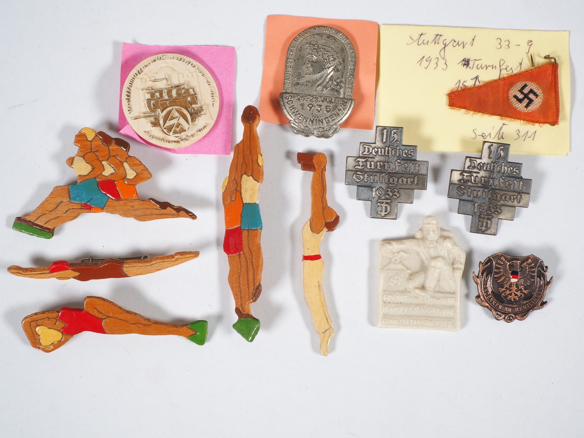 Enthalten ist unter Anderem ein sehr seltenes Hakenkreuz Seidenbändchen des 15. Deutschen Turnfest in Stuttgart von 1933 in gutem Erhaltungszustand. Porzellanabzeichen Sport- und Wehrwettkämpfe SA Gruppe Bayerische Ostmark 1937 (Nadel fehlt). Seltenes Kunststoffabzeichen SA Wettkampftage in Hamburg 14. -18. Juni 1939. Blechabzeichen 1. Gaufest des R.F.L.43. schwäb. Landesturnfest 25.-28.Juli 1935 in Schwenningen a./N. Mehrere seltene Holzbroschen ausgegeben zum Deutschen Turn- und Sportfest 1938 in Breslau. Teilweise vom Einlieferer beschriftet. Großteils sehr guter Zustand. Siehe Fotos.