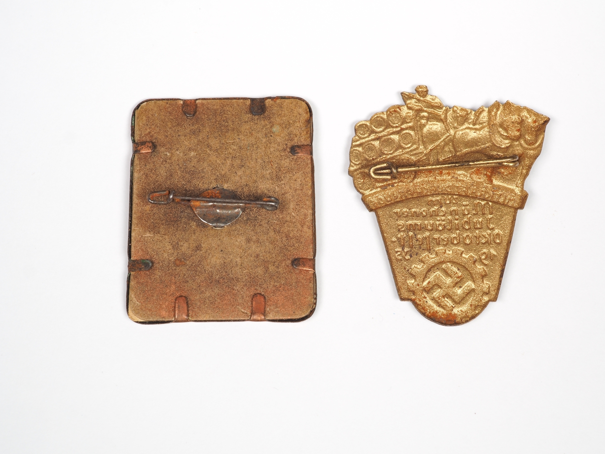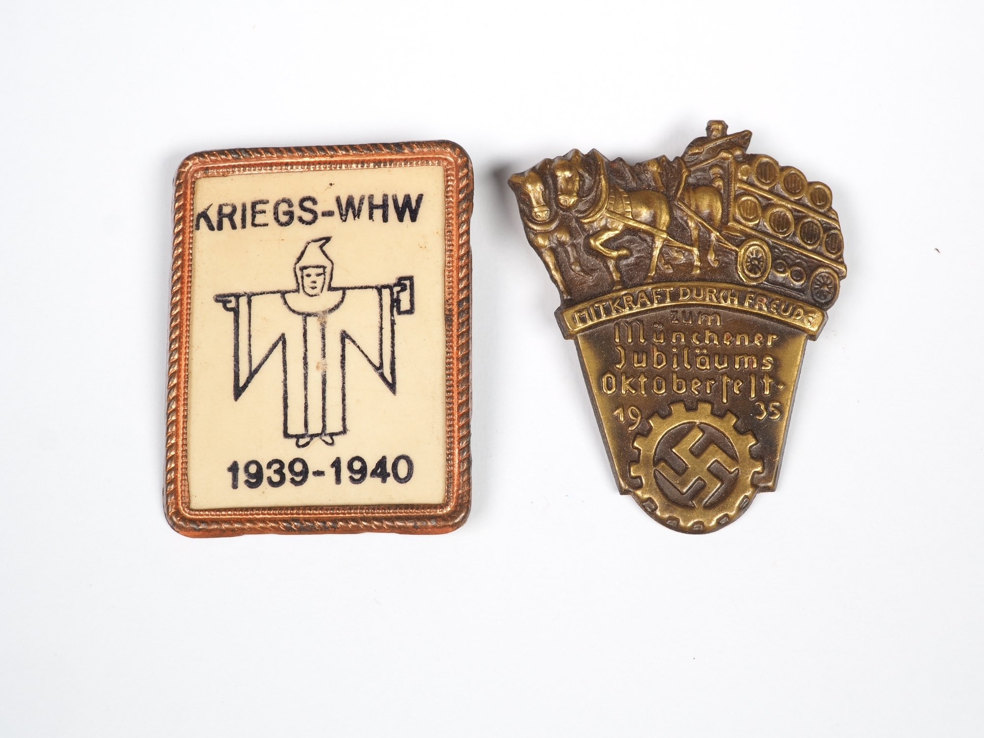 Aus dem Nachlass eines Winterhilfswerk (WHW) Abzeichen bzw. Spendenbelege Sammlers. Selten gut erhaltenes "Mit Kraft Durch Freude" (KDF) Abzeichen zum Münchener Jubiläums Oktoberfest 1935. Zwei Jahre nach der Übernahme der Macht durch die Nationalsozialisten, wurde das 125-jährige Jubiläum des Oktoberfests gefeiert. Die damaligen Machthaber nutzten die Festlichkeiten, um sie unter dem Motto „Stolze Stadt – Fröhliches Land“ zu gestalten und versuchten, die Geschichte des Festes in ihrem Sinne umzudeuten. Entlang des traditionelle Festzug marschierten außerdem Delegationen verschiedener NS-Organisationen. Das Abzeichen ist eine Verdeutlichung wie die nationalsozialistische Symbolik bereits 1935 die Theresienwiese prägte (siehe auch Bavarikon). Anbei ein Kriegs-WHW Abzeichen GAU München mit Münchner Kindl von 1939-1940.