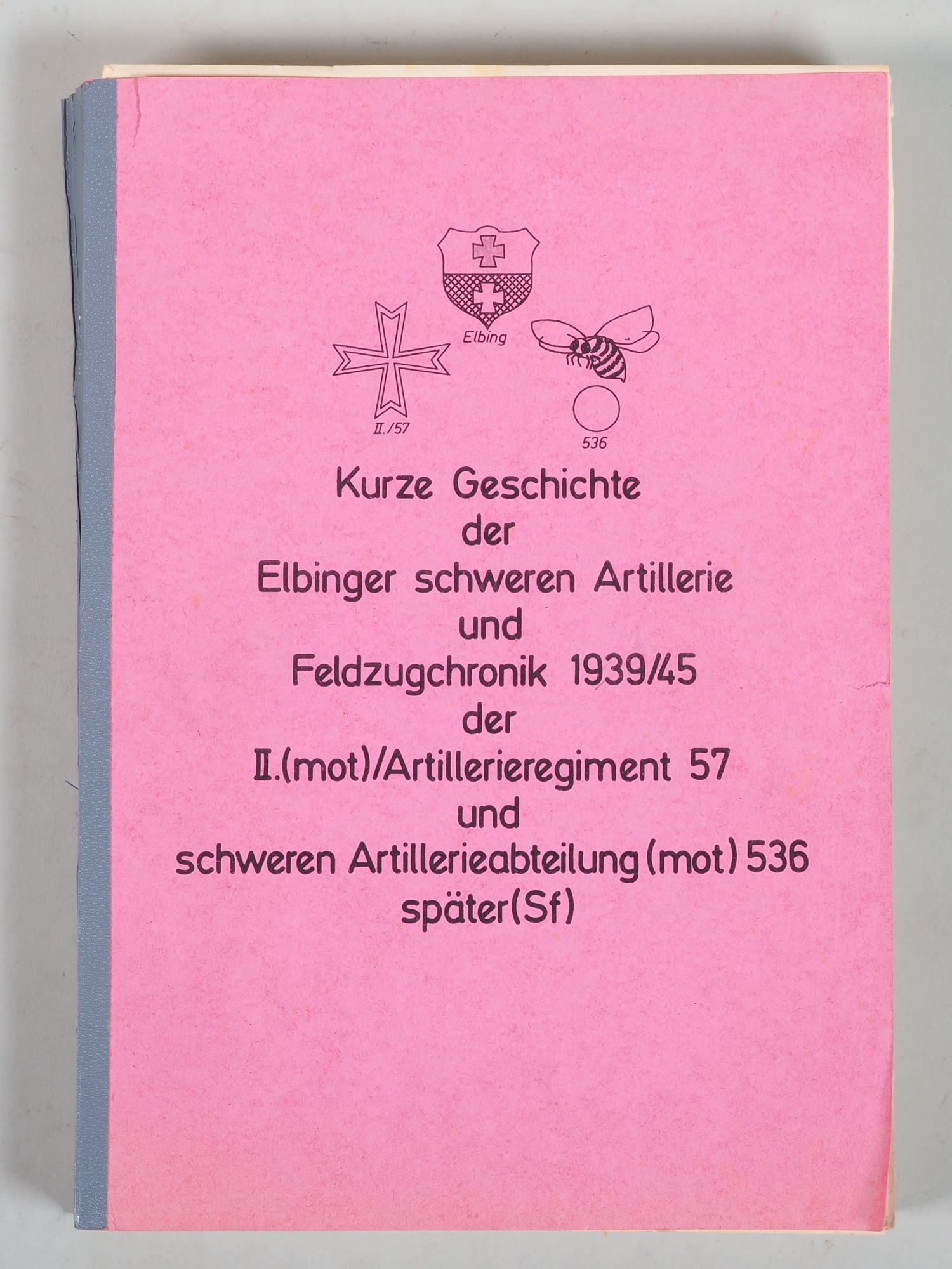 Sehr interessante 2.Weltkrieg Chronik, Geschichte der Elbinger schweren Artillerie (Garnison Elbing Ostpreußen)recht schwer, mehrere hundert Seiten mit Kampfräumen, Einsatzräume, Stellenbesetzung, Namenslisten, Ausstattung mit Material Fahrzeugen etc. Landkarten, eine dezidierte Chronik dieser Artillerieverbände, Eigenverlag, nicht mehr zu bekommen!