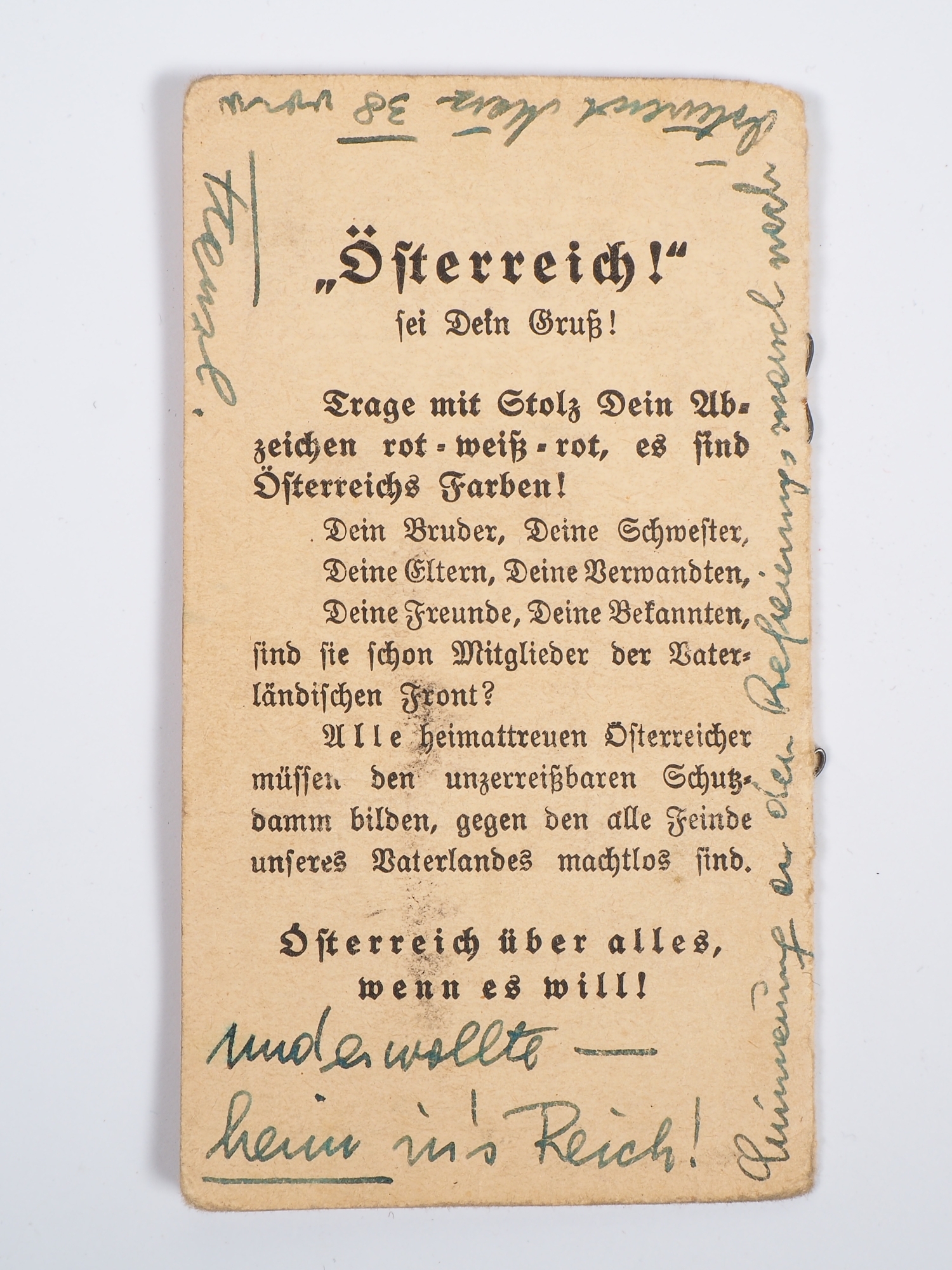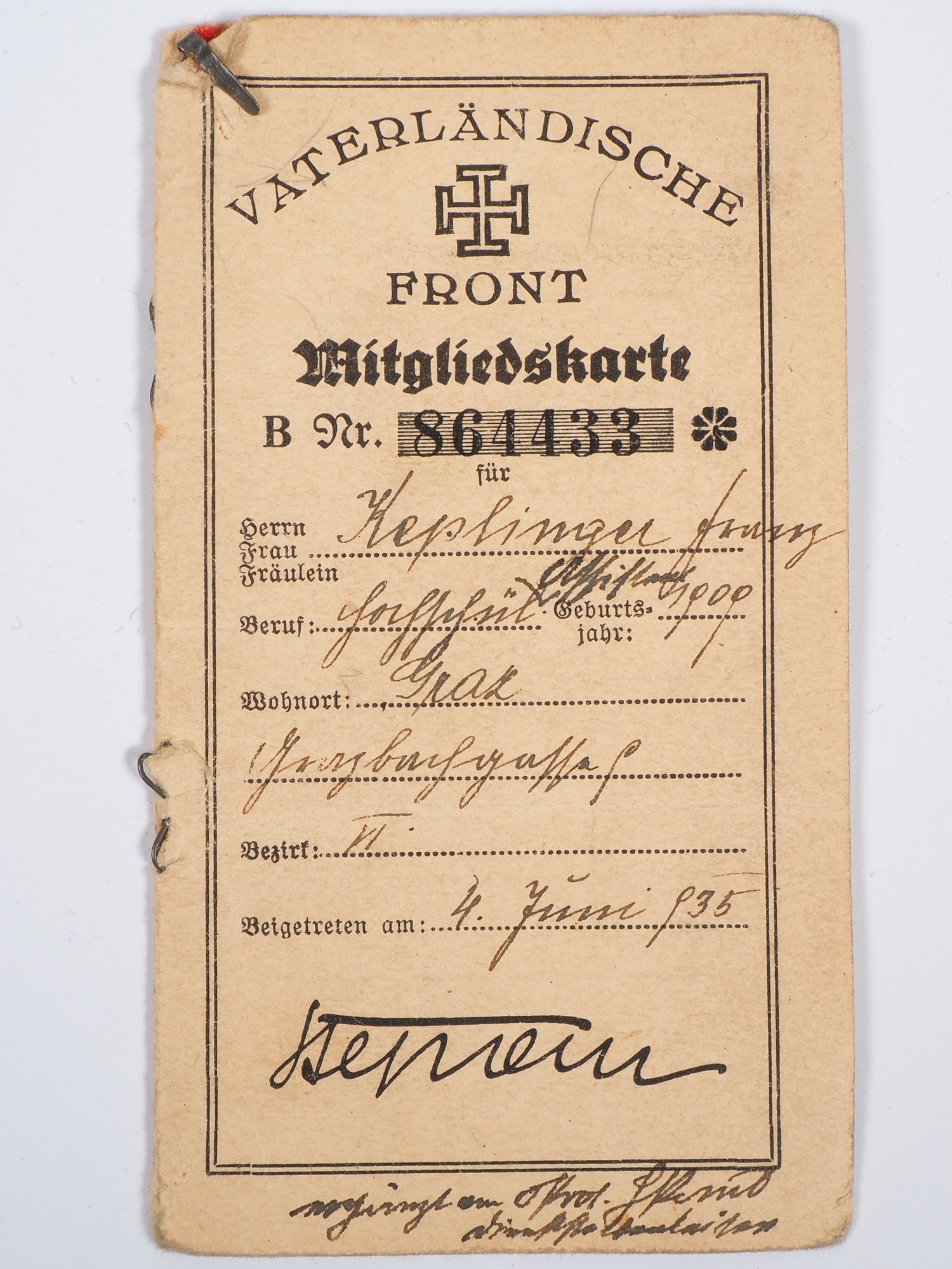 Originalausweis der vaterländischen Front Österreich , Zeitalter des sogenannten Austrofaschismus, geführt 1936-1937