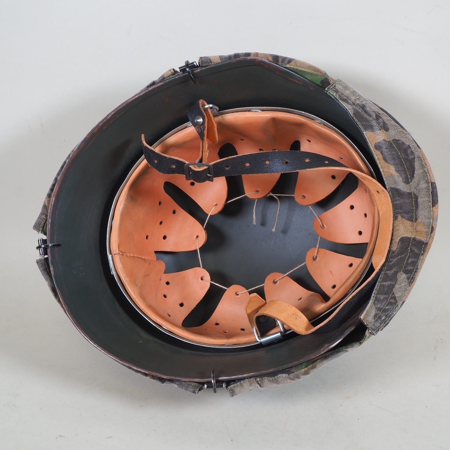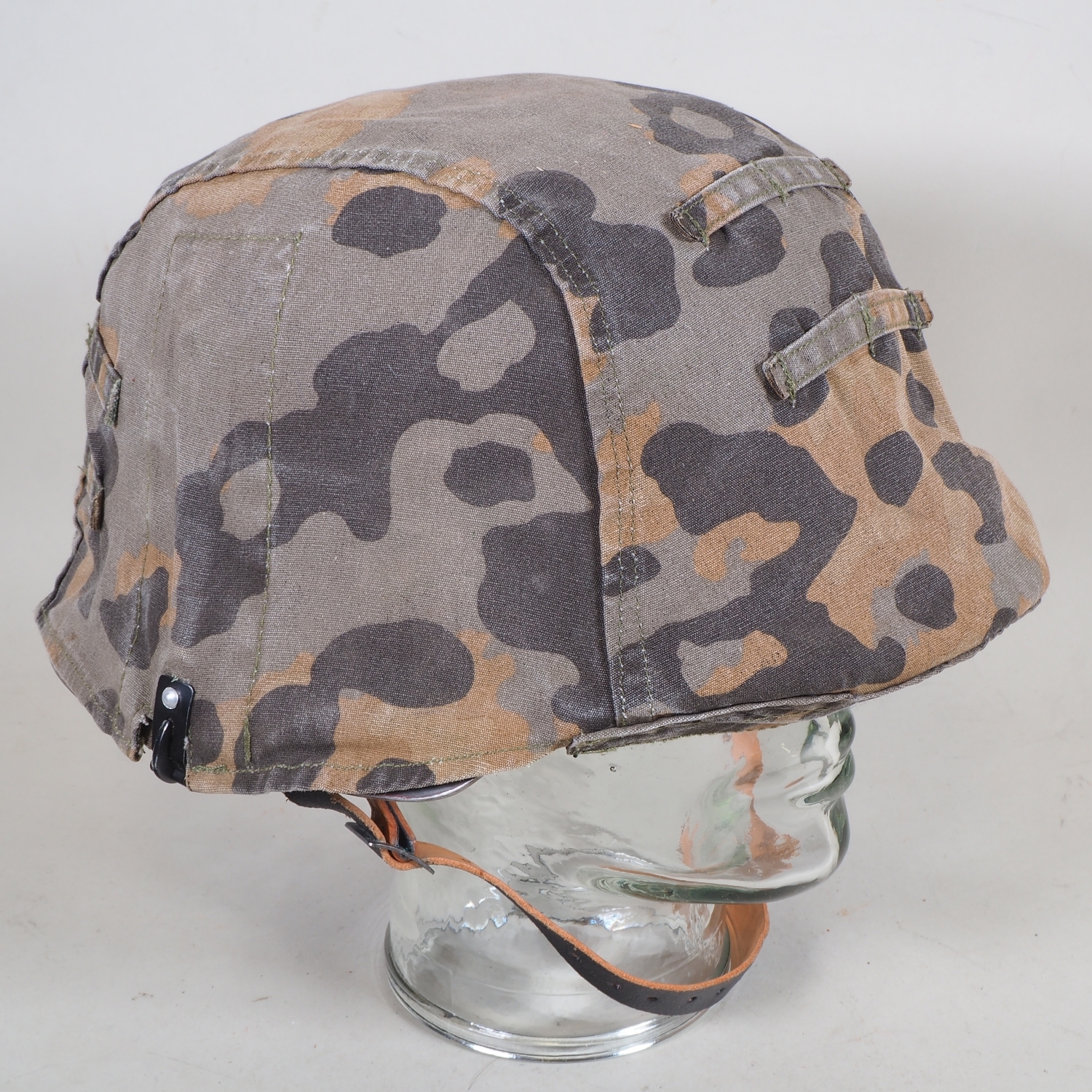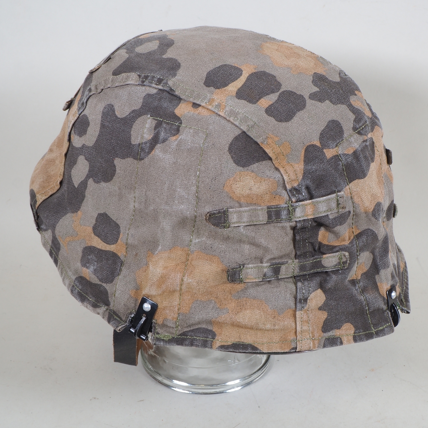 Stahlhelm gestempelt "64TSR" mit Innenfutter und Kinnriemen, mit detailgetreuem Waffen-SS Tarnbezug mit Erbstarn Muster, Für Reenactment oder Diorama, günstige neuzeitliche alternative.