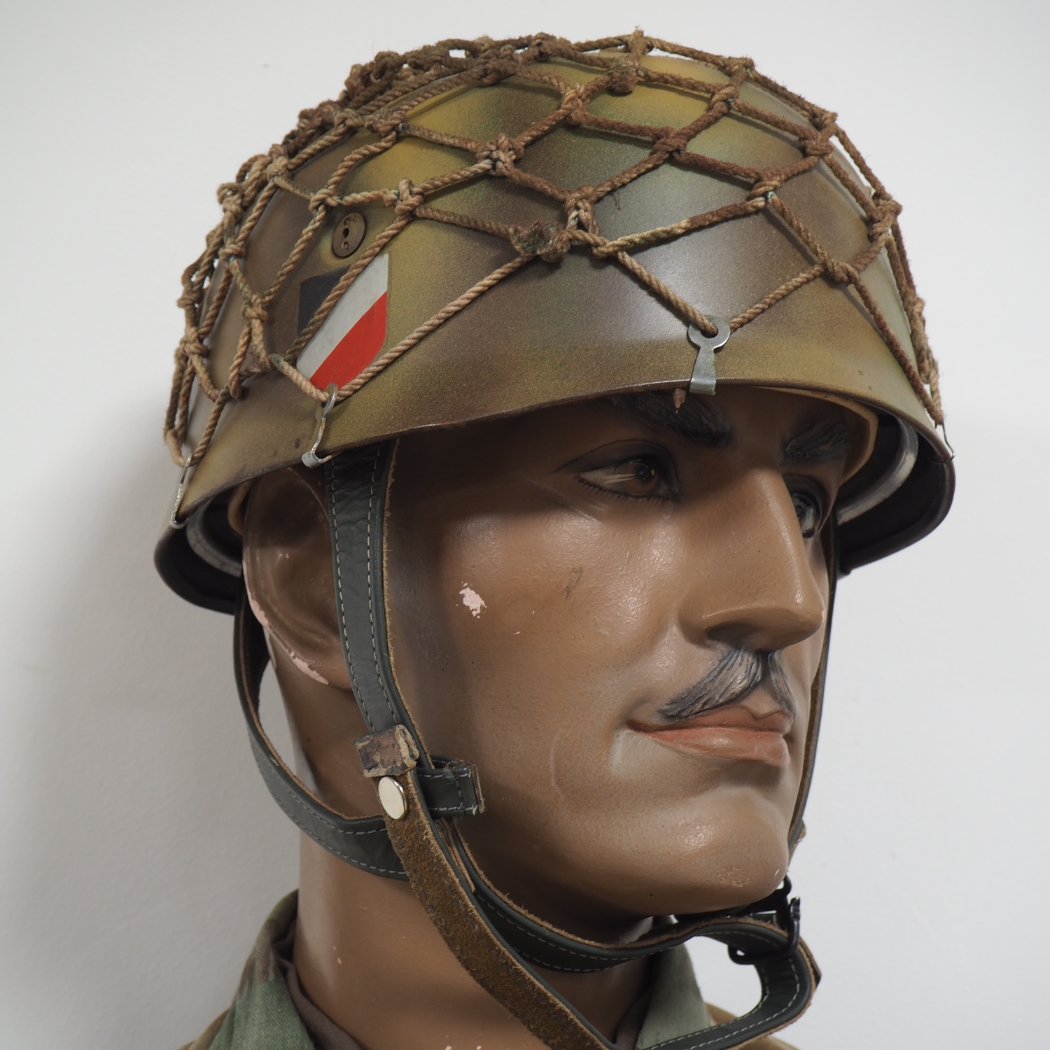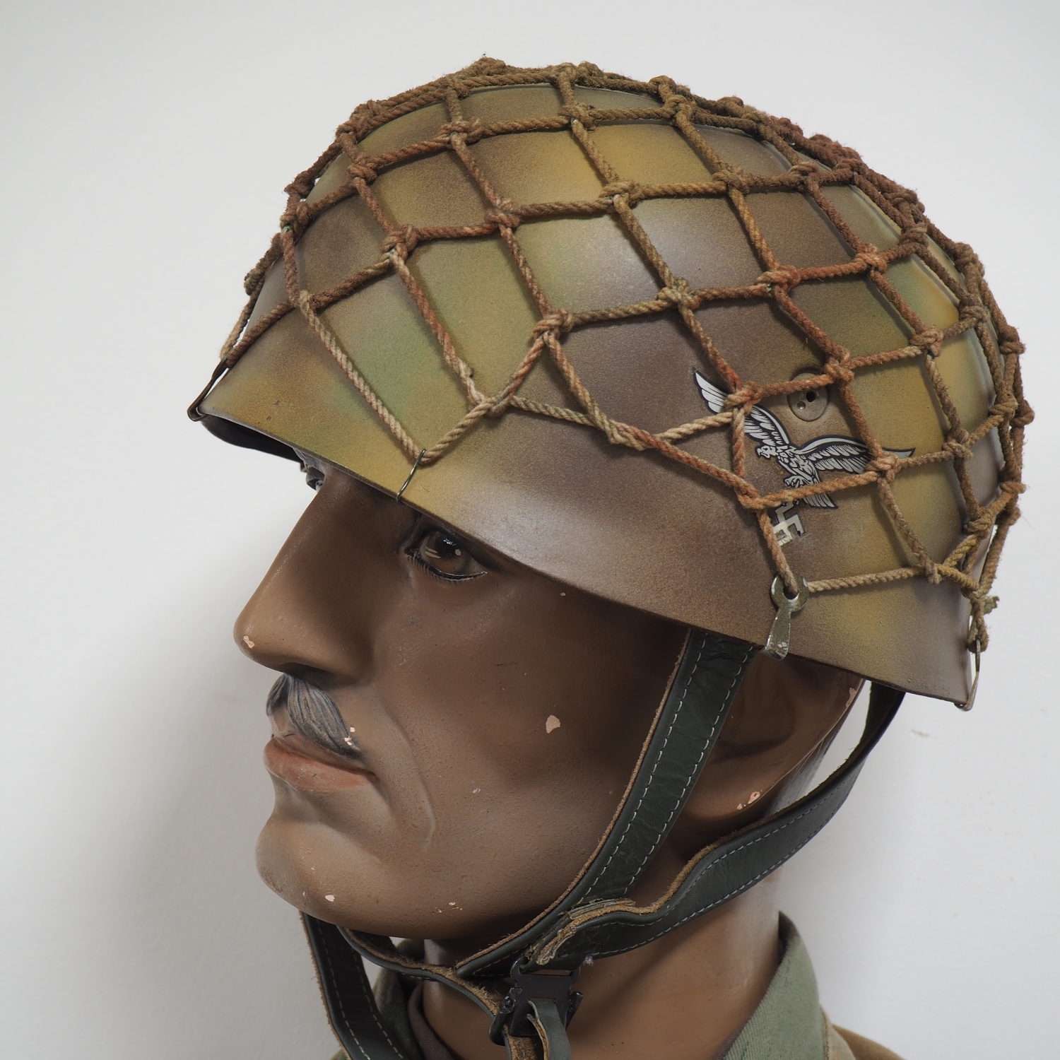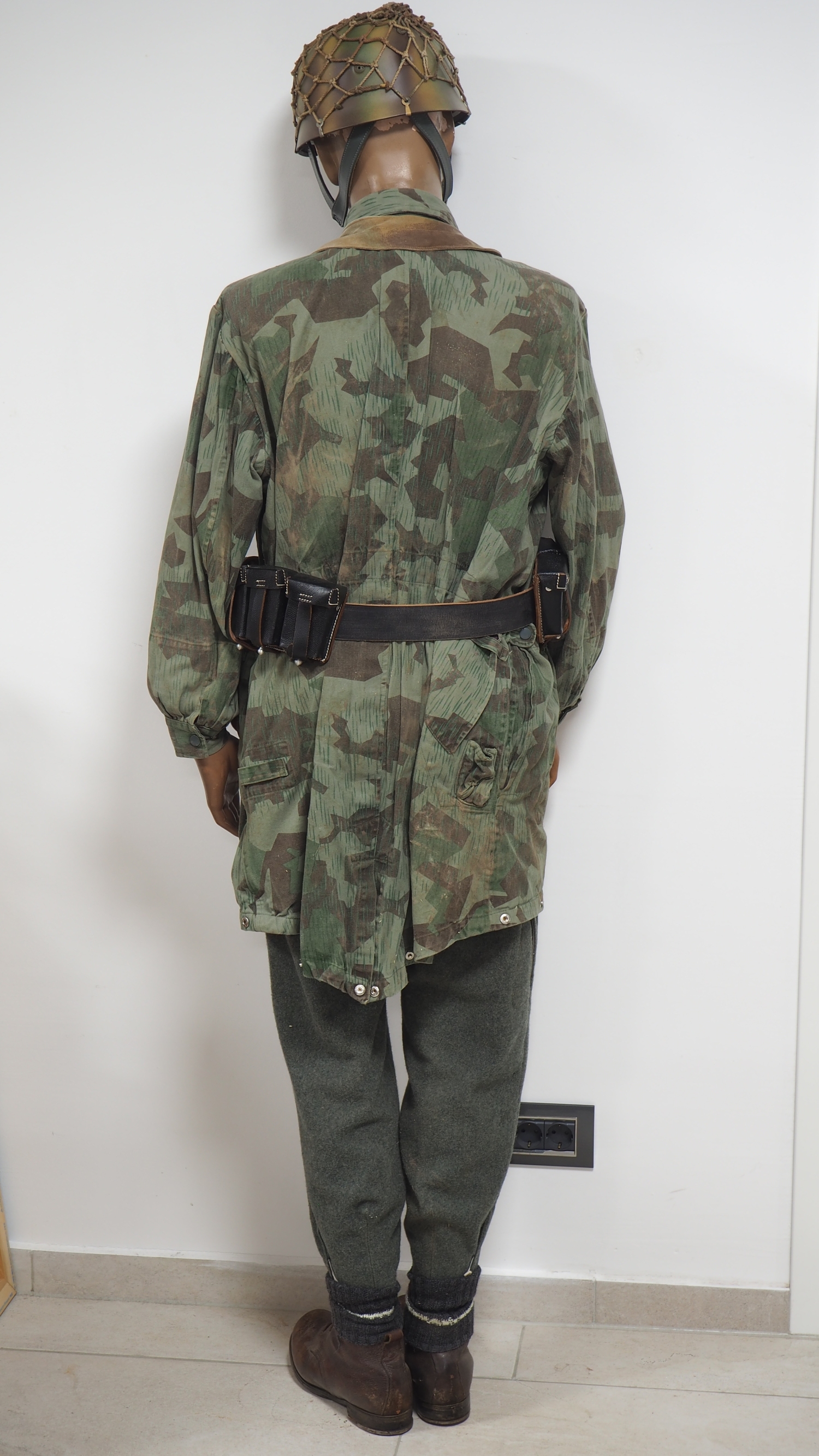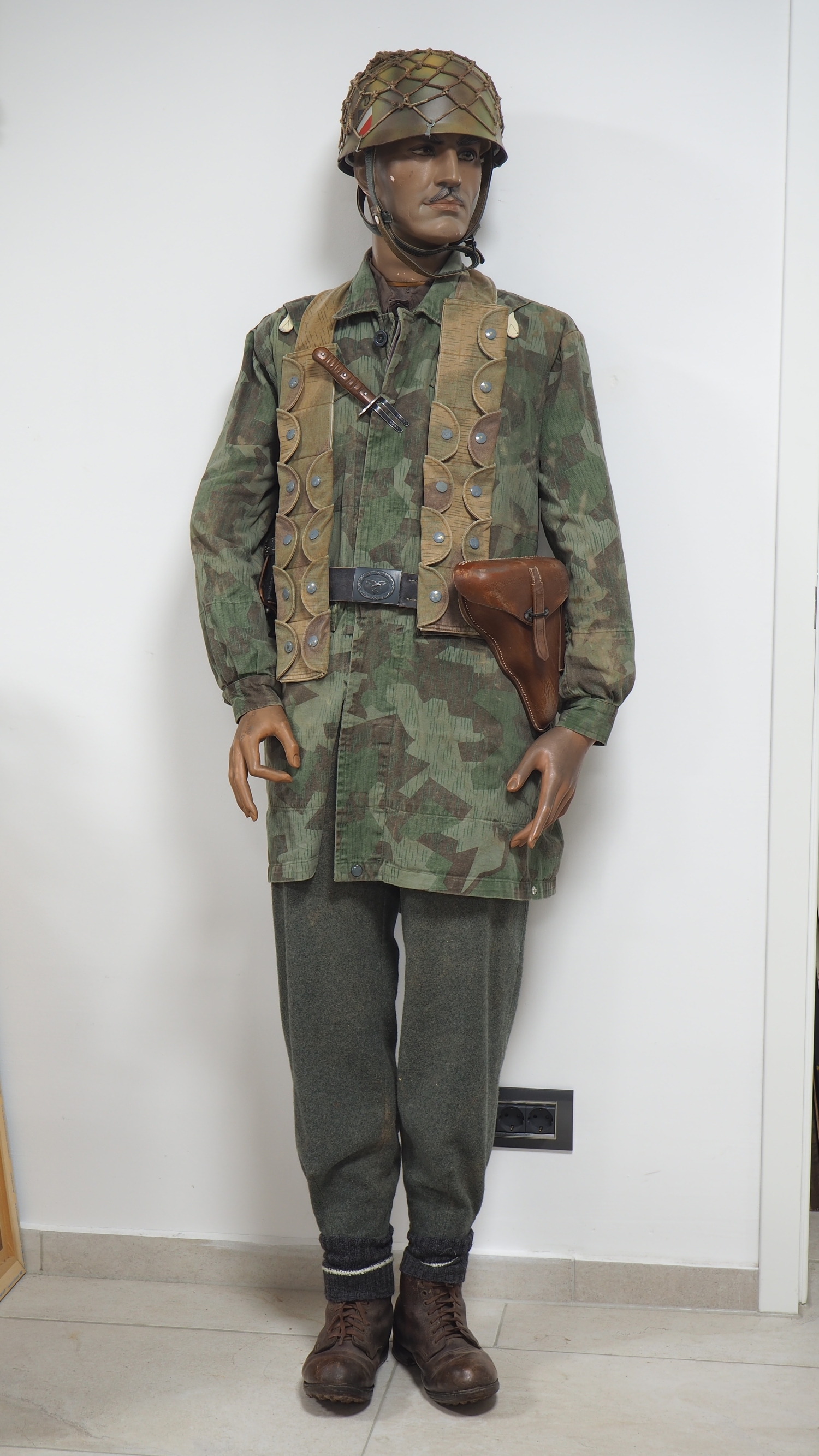 vollständig ausgerüstete Schaufensterpuppe in der Darstellung eines WH Luftwaffen Fallschirmjägers, detailgetreu nachempfunden, mit Stahlhelm M38, Knochensack Tarnjacke, K98 Patronengurt in Splittertarn, Hose, wohl originale Leder Schnürstiefel für Gebirgsjäger, Koppelriemen mit LW Kastenschloss und P38 Pistolentasche, sowie Paar K98 Patronentaschen, am Knochensack angebrachtes Kampfmesser. Wohl weitestgehend hochwertige Sammleranfertigung für lebensgroßes Diorama bzw. Reenactment. Bergschuhe könnten original sein. Alles auf hochwertiger alter Puppe in Lebensgröße mit steckbarem Kopf (drehbar) und einstellbaren Armen. Versand kann auf Anfrage auch ohne Puppe erfolgen.