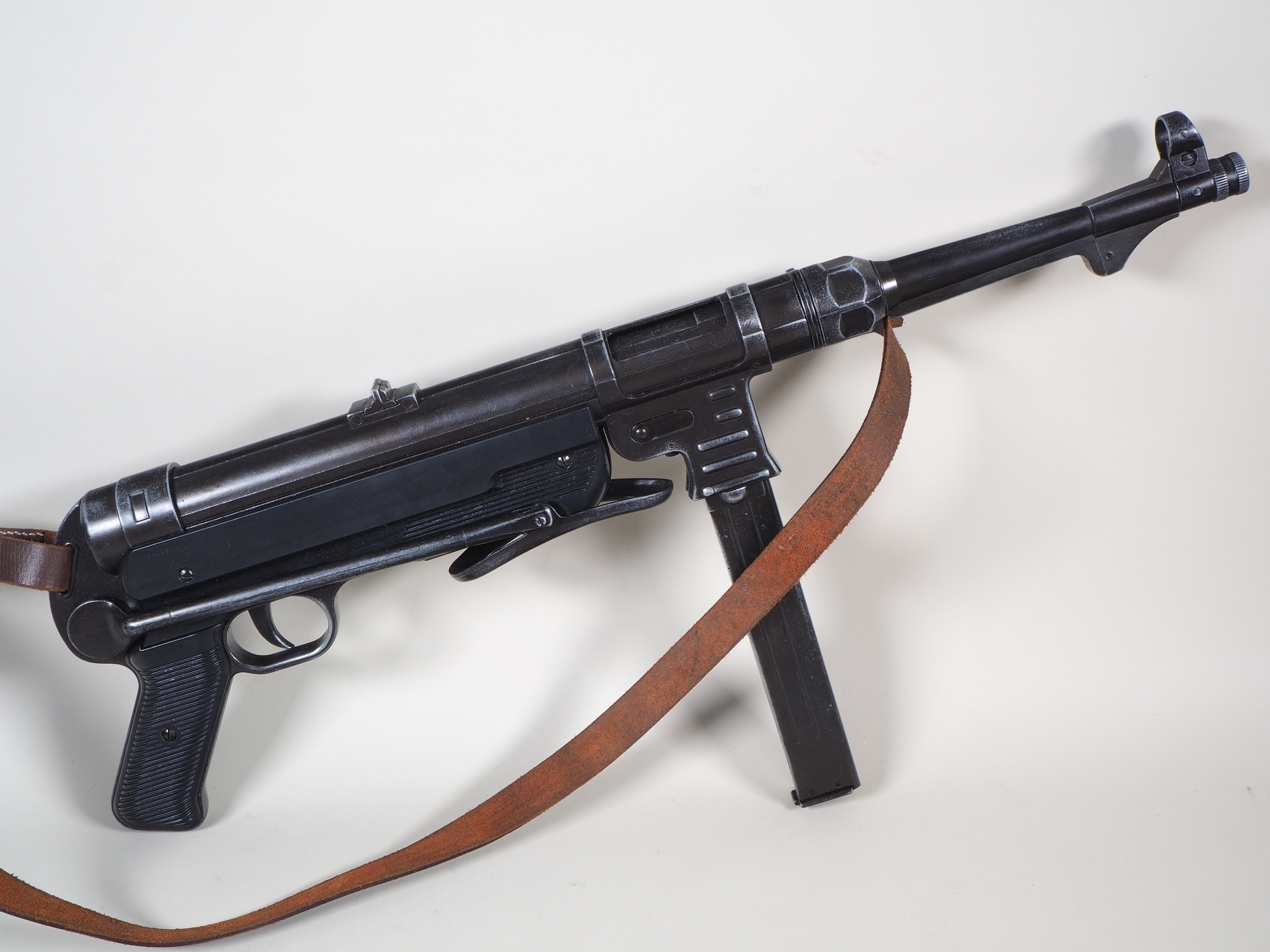 nicht schussfähige neuzeitlicher Nachbau nach Originalvorlage, originalgetreuer Nachbau aus Metall mit ausklappbarem Schaft, mit Leder Tragegurt, mit beweglichem Verschluss und Abzug. Herausnehmbares Attrappen Magazin. Nachweisfrei erhältlich / legaler Besitz. Ideal für Reenactment oder Diorama Schaufensterpuppe, günstige und frei erhältliche Alternative. L. 61cm.