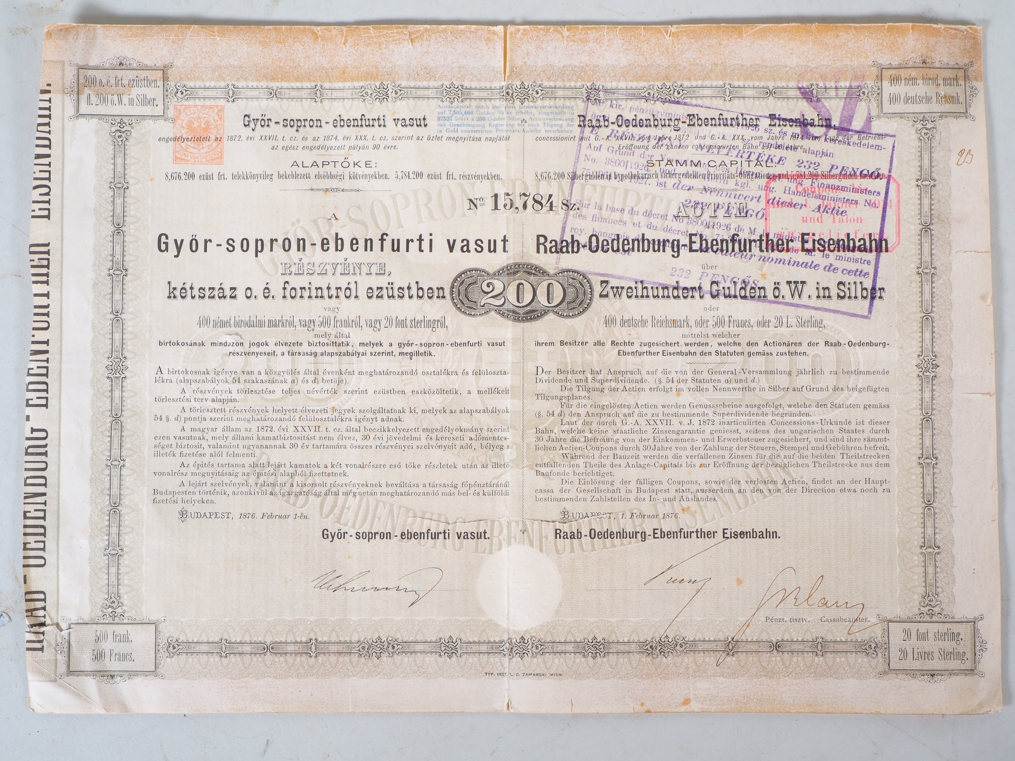 Österreich-Ungarn: Raab-Oedenburg-Ebenfurther Eisenbahn Aktie 200 Gulden, 1876
