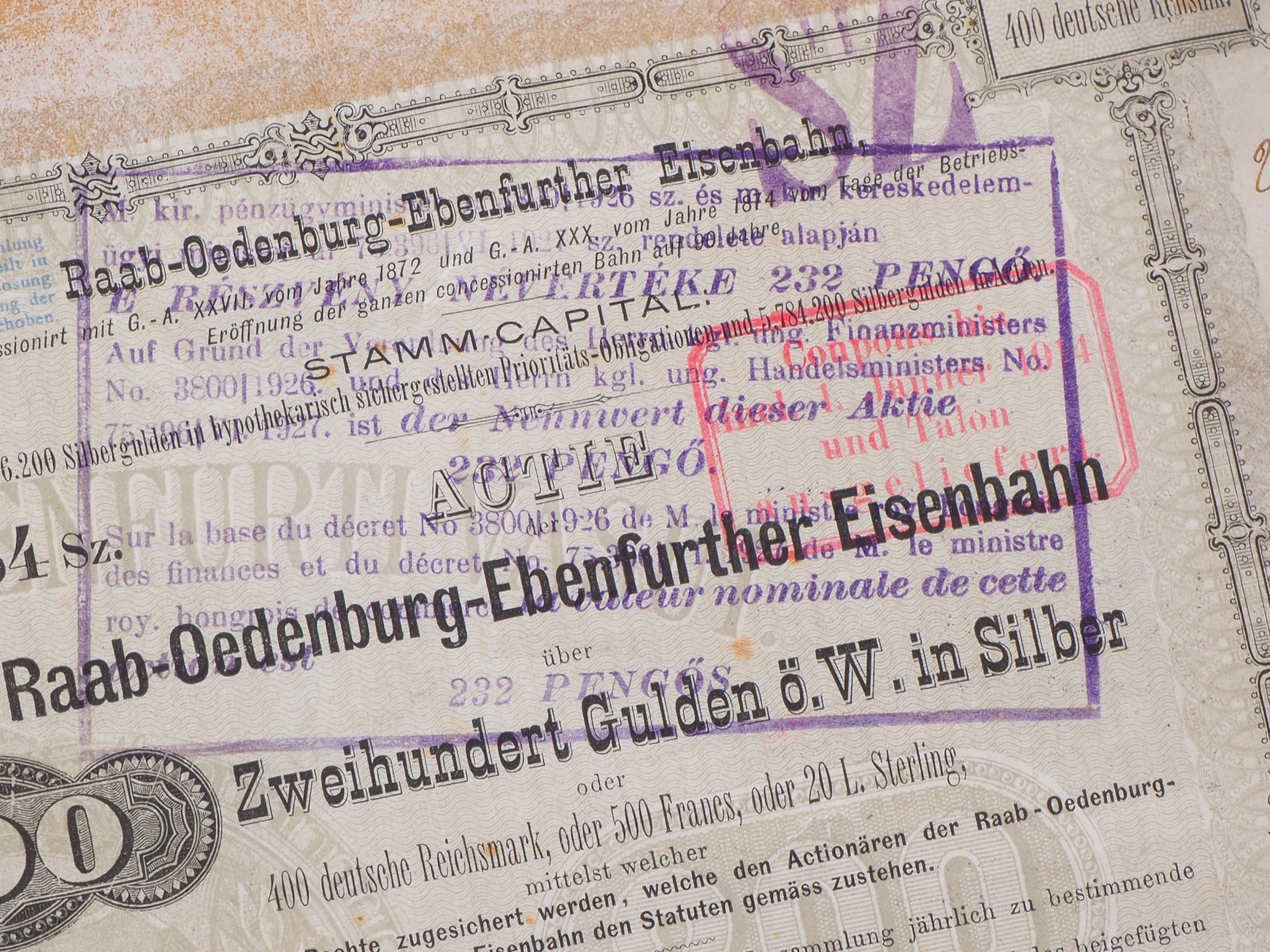 Györ-Sopron-Ebenfurti vasut Aktie über 200 Gulden ö.W. in Silber oder 400 deutsche Reichsmark, oder 500 Francs, oder 20 L. Sterling. Gestempelt "…Nennwert dieser Aktie 232 PENGÖ". 25 x 35cm. Etwas über dem Blindsiegel 7cm eingeschnitten. Rückseite mit dickerem Papier verstärkt