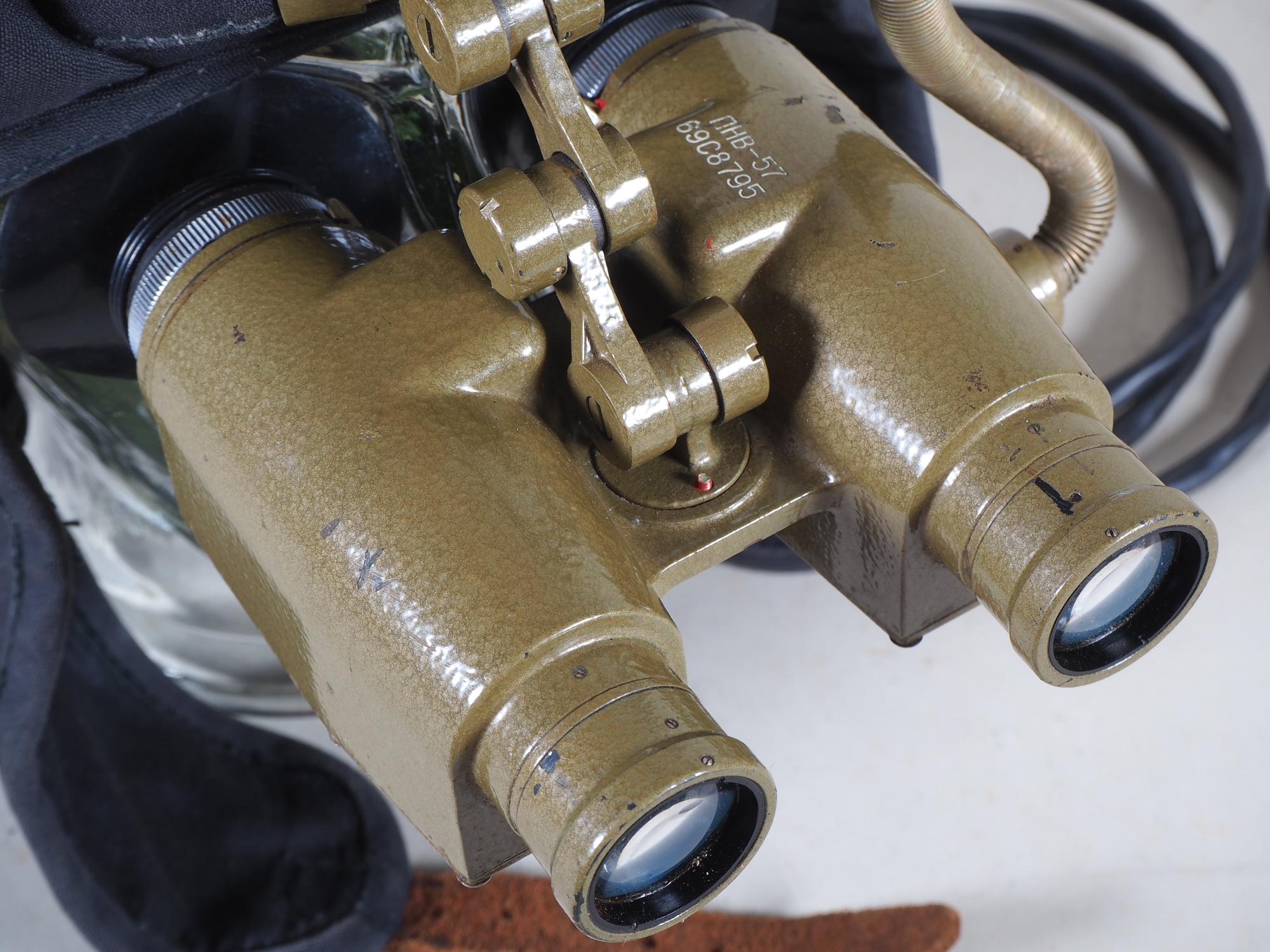 funktionsfähiges sowjetisches Nachtsichtgerät aus der Zeit des Kalten Kriegs, wohl im Fahrzeug Einsatz wie z.b. Panzer. Mit zugehörigen Infrarotlampen und intaktem IR-Streufilter, eine Dose mit Abdichtwachs, zwei originalverpackte Gleichrichterröhren ZBK-1. Nachtsichtgerät ist auf Panzerhelm montiert. Kopfhaube innen im Nacken gestempelt und datiert 1969. Beobachtungsgerät mit olivgrünem Metallgehäuse, Modell und Seriennummer auf kyrillisch "PNW-57". Voll Funktionsfähig (mit 12V geprüft), mit original Kabel für Fahrzeug Anschluss, kann aber auch mit 9V Blockbatterie verwendet werden. Guter Originalzustand in schwarzer Metall Transportbox.