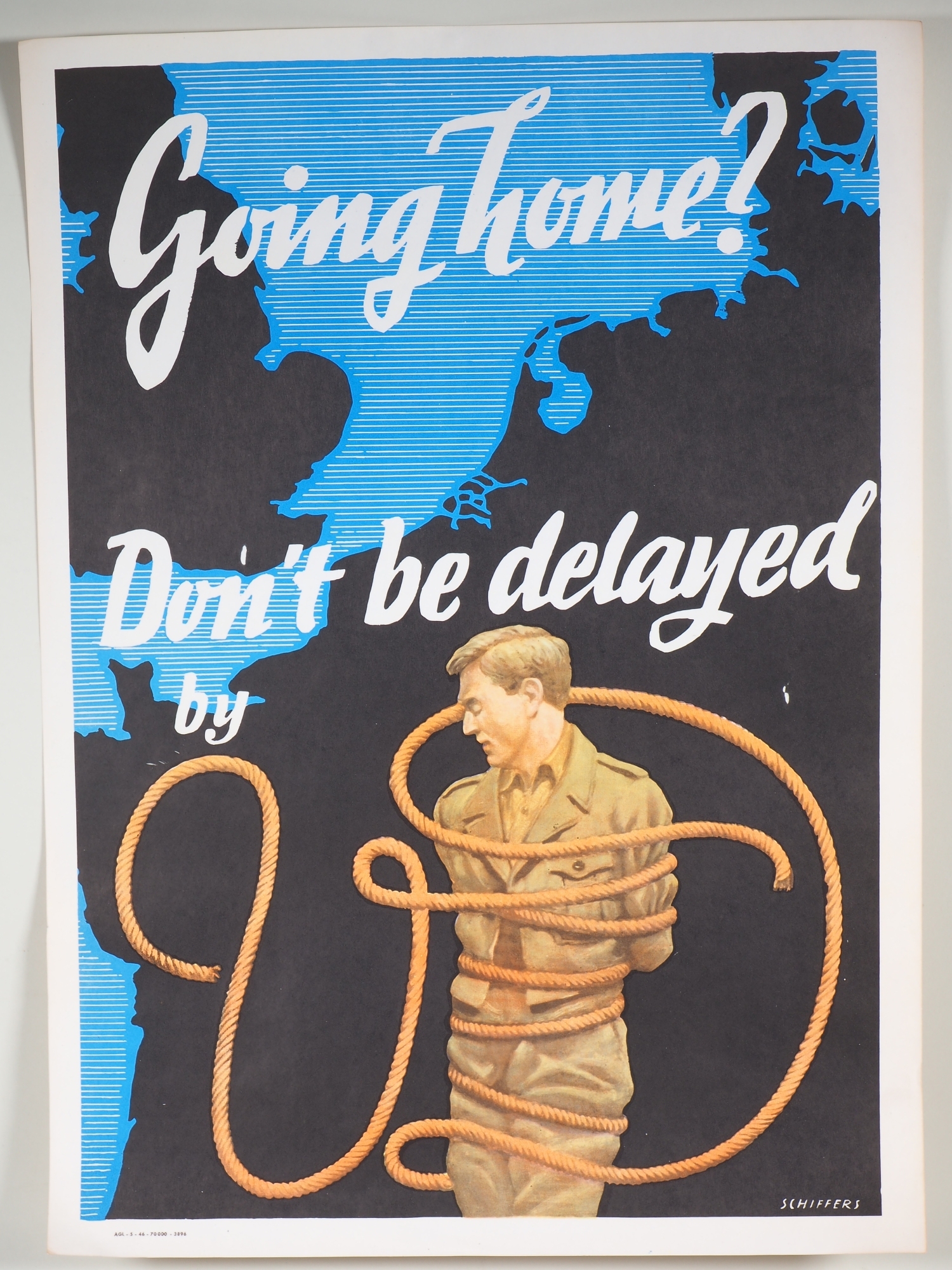 Lithografie, aus der ehemaligen US Kaserne Wiley Neu-Ulm. Bez. "Going home? Don’t be delayed by VD", 57x41cm, guter Erhaltungszustand mit natürlicher Patina. – Franz Schiffers (1902-1976) erhielt den Auftrag, mehrere Plakate zur Warnung vor Geschlechtskrankheiten für die US-Soldaten in Übersee zu entwerfen. Auf diesem Plakat schwebt ein gefesselter Soldat mit seinen eigenen Wünschen über einer riesigen Karte von Europa.