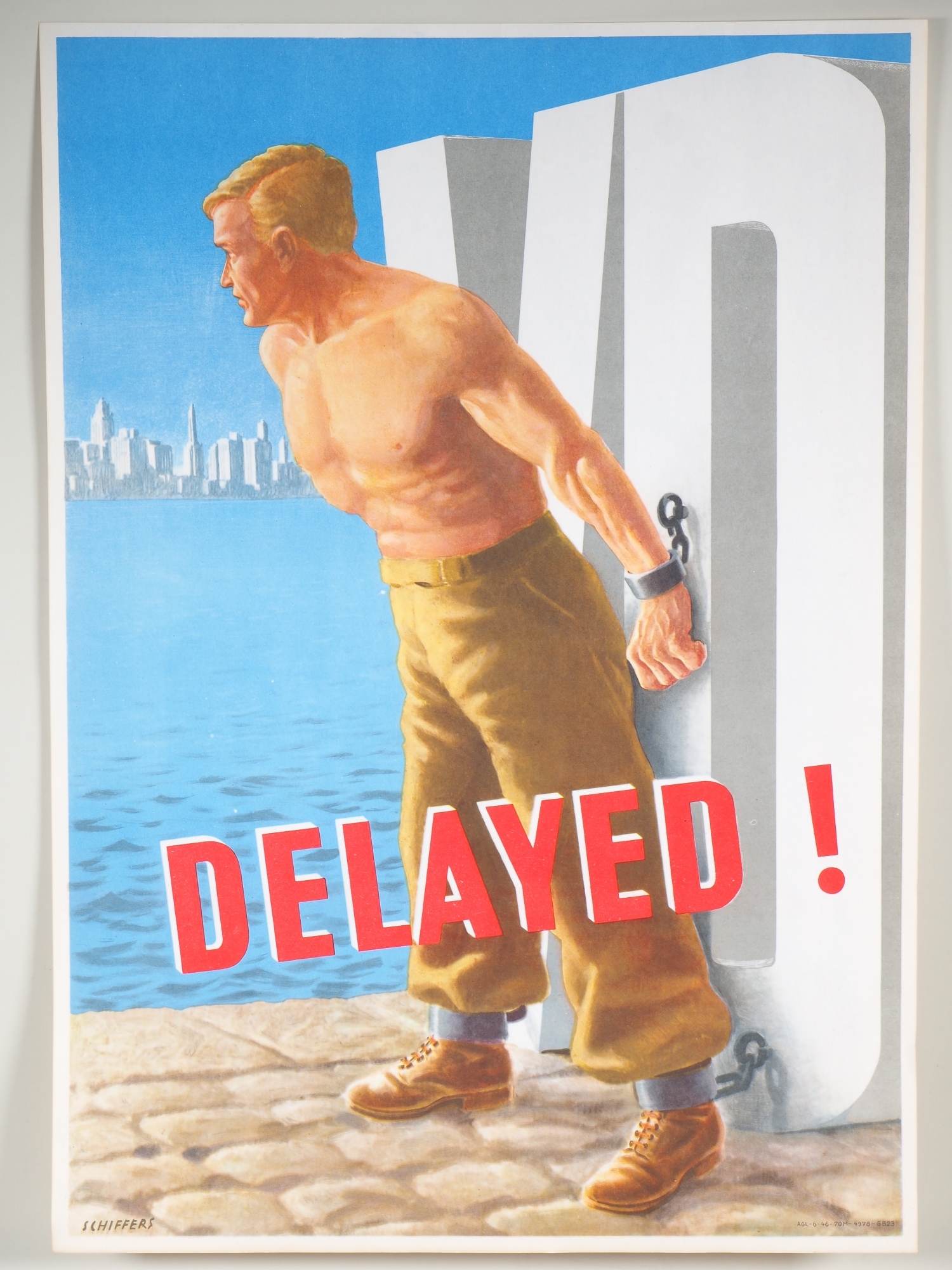 Lithografie, aus der ehemaligen US Kaserne Wiley Neu-Ulm. Bez. "Delayed!", 55,5×39,5cm, guter Erhaltungszustand mit natürlicher Patina. – Franz Schiffers (1902-1976) erhielt den Auftrag, mehrere Plakate zur Warnung vor Geschlechtskrankheiten für die US-Soldaten in Übersee zu entwerfen. Hier die Darstellung eines Mannes in Ketten befestigt an den Buchstaben "VD" = Venereal Disease für Geschlechtskrankheit.