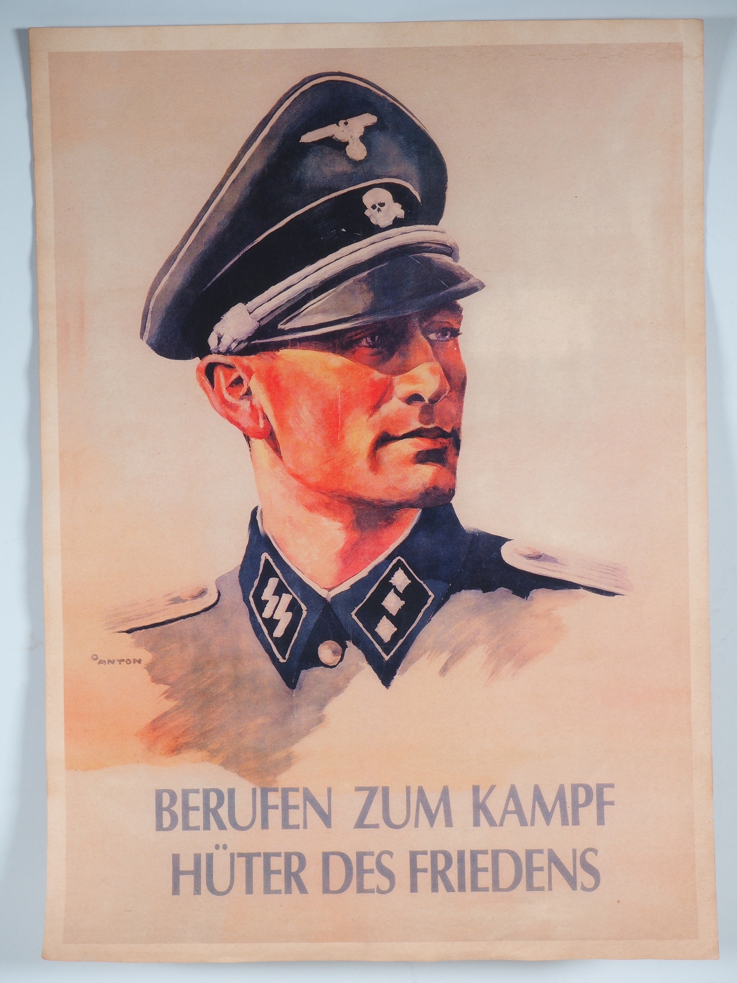 Lithografie Kriegsplakat für Rekrutierung im Dritten Reich oder bei der Waffen-SS, Darstellung eines SS-Untersturmführers der Waffen-SS mit heroischem Blick, darunter bez. "Berufen zum Kampf / Hüter des Friedens". Guter Zustand, nicht geknickt oder gerissen, Papier altersbedingt vergilbt. Maße 43,7 x 31,2cm.
