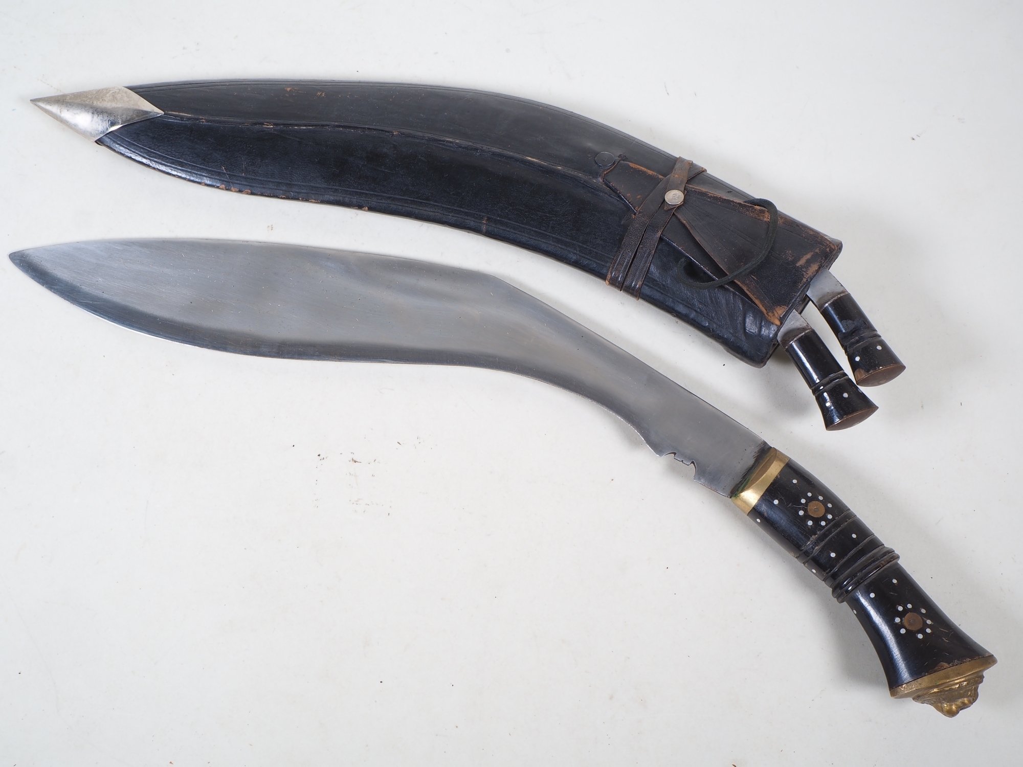 Khukuri Machete, einschneidige stark gekrümmte Klinge, scharf. Horn Griff mit Messing Beschlägen, Lederscheide mit Schlaufe, wohl Mitte 20. Jh. Gesamtlänge mit Scheide 52cm. Mit 2 kleinen Miniaturen.