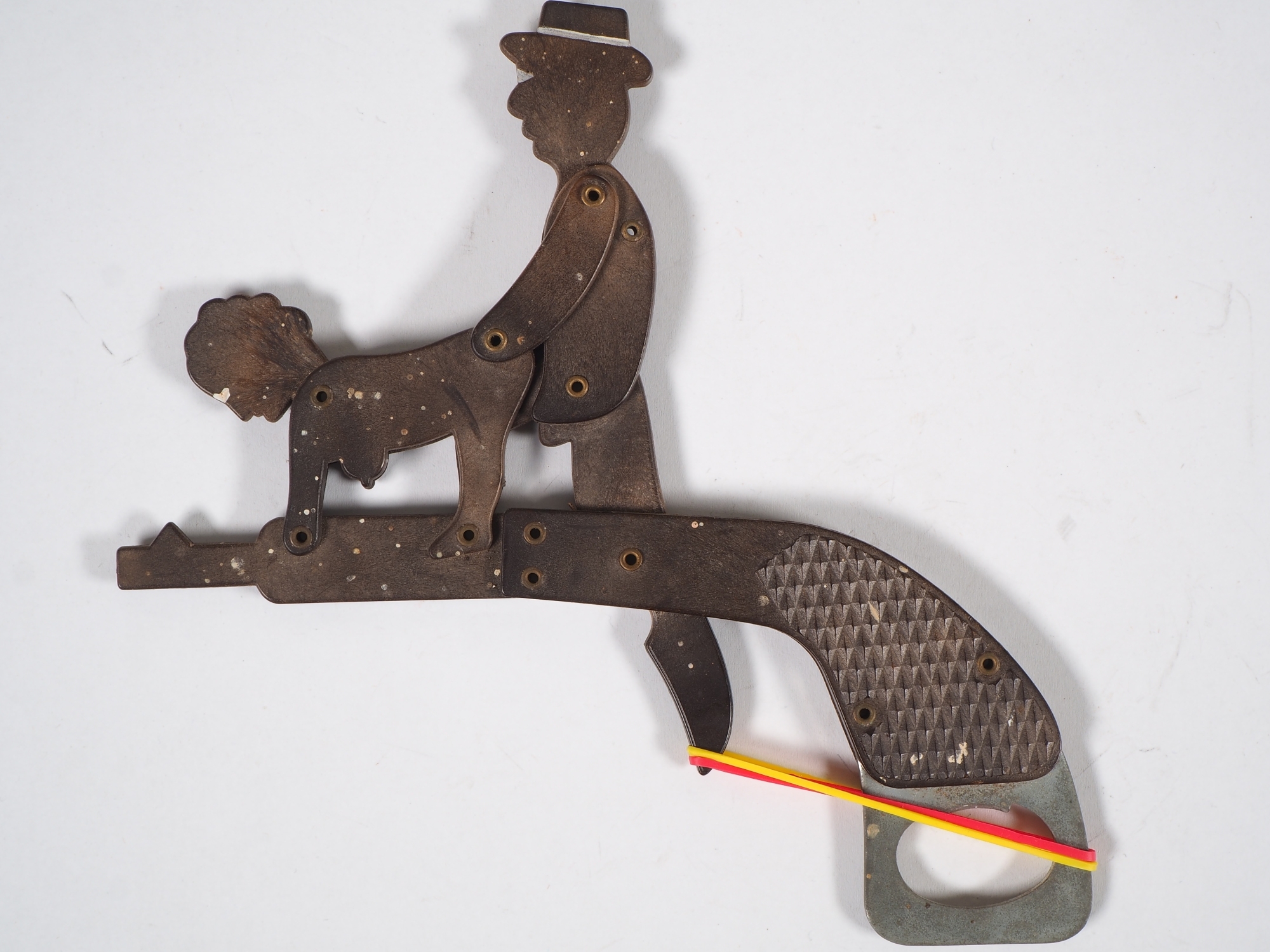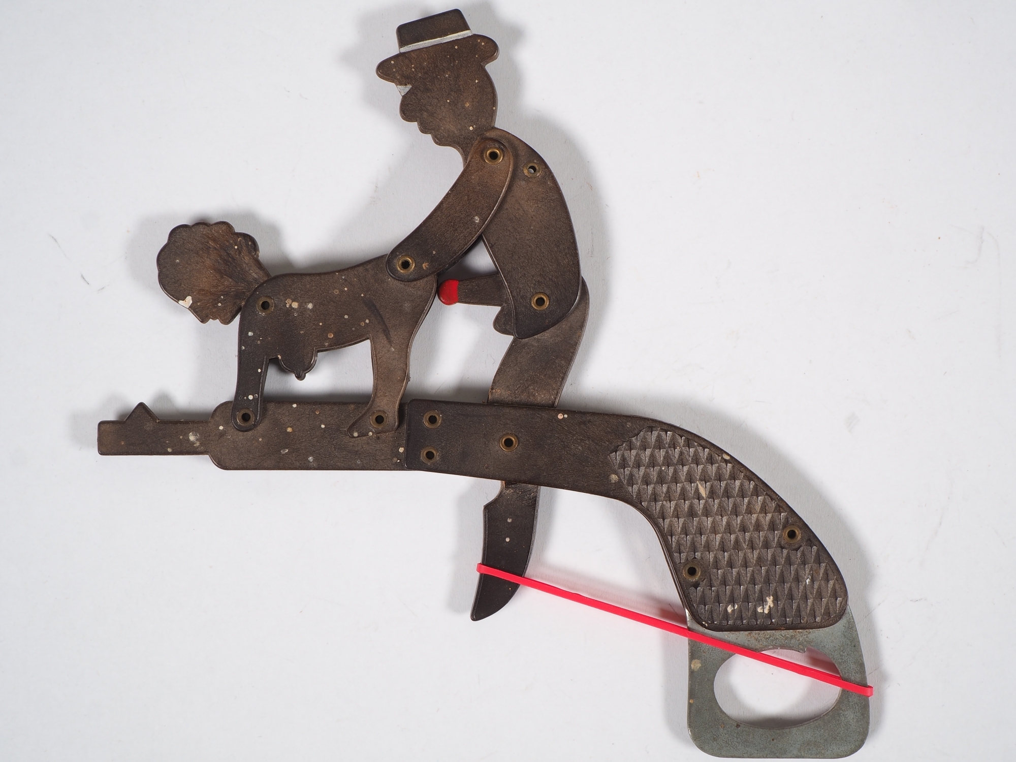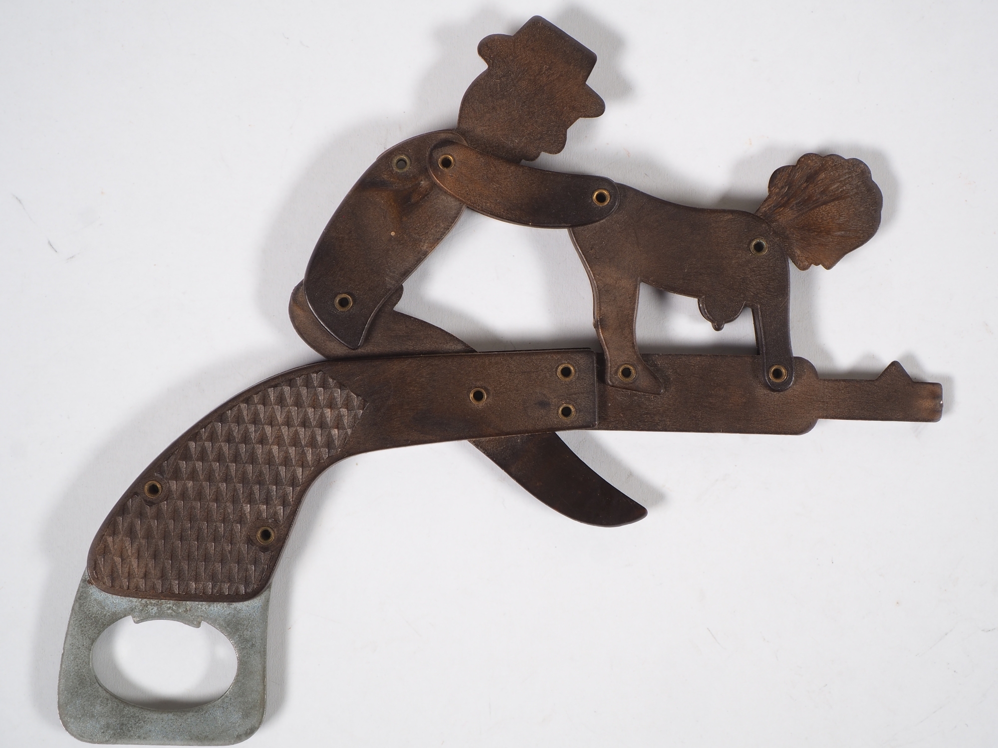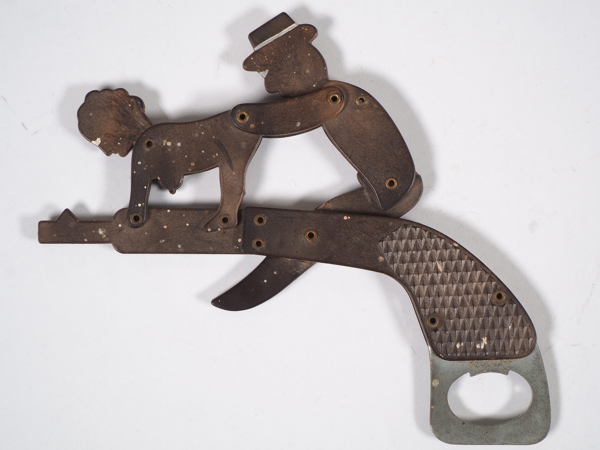 pistolenförmiger Flaschenöffner aus braunem Bakelit, mit gelenkigen Figuren in erotischer Pose, beim Betätigen des federgespannten Abzugs beugt sich die hintere Figur nach vorne und das männliche Glied schiebt sich raus. Am Griffende der Metall Flaschenöffner. L. 17cm.