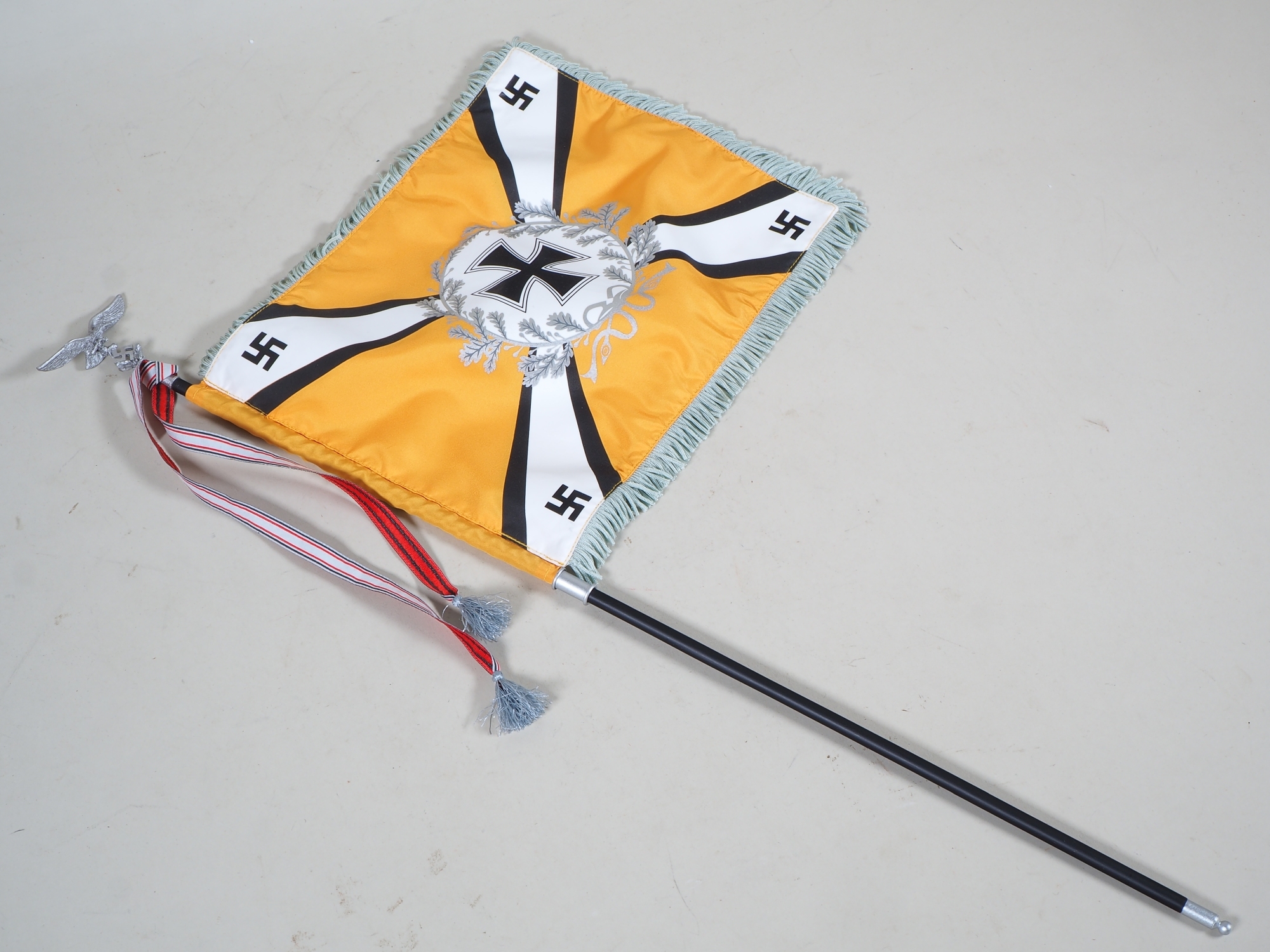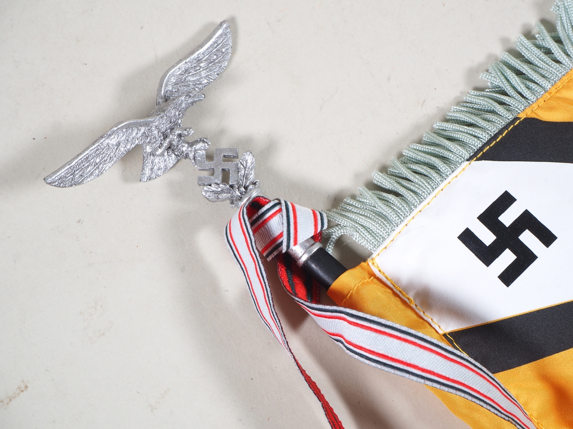 gelbe Waffenfarbe, Spitze als Luftwaffenadler vollplastisch aus Metall versilbert. Wimpelstange zweiteilig steckbar. L. 53 cm. Fahne 26 x 20cm. Originalität nicht geprüft, wohl NK